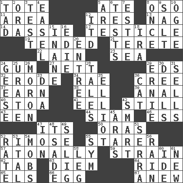ACROSS 1. Haul 5. Had dinner 8. Bear (Spanish) 11. Type of rug 12. Angers 13. Tired old horse 14. Hyrax 17. A testis 19. Looked after 21. Cylindrical with tapered ends 22. (Had) reclined 23. Ocean 24. Chewing product 27. Remaining after all deductions 29. Begley and Asner 32. Eat (away) 34. Actress Charlotte 36. Algonquian 37. Merit 38. Pipe bend 39. Of or related to the anus 40. Portico 41. Snakelike fish 42. Free from disturbance or agitation 43. Car or cant ending 44. Thailand, formerly 46. Double-curved letter 47. ___ a Wonderful Life 50. Mouths or openings 52. Full of chinks, cracks, or crevices 55. A viewer who gazes fixedly 57. Lacking a tonal center or key 59. Put through a sieve 62. Keyboard key 63. South Vietnam president (1954) 64. Travel on an animal 65. Raised railways 66. Ovum 67. Afresh DOWN 1. Bit 2. Mouth or opening 3. Trial 4. Artist's stand 5. "We ___ not amused" (Victoria) 6. Trials 7. First name in cosmetics 8. At one time in the past 9. Table seasoning 10. Double curve, resembling the letter S 12. It would 15. Empty; void 16. Singer Brickell 18. Lyricist Gershwin 20. Main course 24. Honkers 25. A salt of uric acid 26. Person of subnormal intelligence 28. Falsehoods 29. Bert's buddy 30. Allots cards 31. Makes a sale 33. Heredity factor (abbr.) 35. American author Paul (1891-1958) 36. Feline 42. Don Adams' spy role 45. Ancient river in northeast Turkey 47. Electrically charged atom 48. Sadhe (variant) 49. Major League Baseball Commissioner Bud 51. Spanish missionary in California 52. Pace 53. Slanted text style (abbr.) 54. Disorderly crowds 55. Symbol (abbr.) 56. Water falling in drops from the sky 58. Part of a journey 60. Binary compound 61. ___ Haven, CT