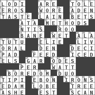 ACROSS 1. Farming town in central California 5. "We ___ not amused" (Victoria) 8. Lacquered or enameled metalware 12. Greek god of love 13. Had on 15. An important port of Yemen 16. Clothes sense 18. (Had) reclined 19. Wagers 20. "One Day ___ Time" 22. Modes 24. Nuclear Threat Initiatives 26. Friend of Pooh 27. Object of repulsion 28. Soggy 29. Insect wing 32. Ballerina skirt 35. Writer Wiesel 37. 54 in ancient Rome 38. Taken by mouth 39. Lair 40. Tenth: prefix 41. Groovy apt. 42. Nourish 43. On the rocks 44. Raised railways 45. Slender fish 46. Lyric poems 49. For each 50. Electrical Unit 51. Mood resulting from idleness 55. Superhero pair 56. Native american tent (variation) 57. Inky black, to poets 59. Metal shackles 63. Dutch treat 64. Ear part 65. Relationship diagram 66. American tennis player Robert 67. Eastern Standard Time (abbr.) 68. Examine hastily DOWN 1. Allow 2. Mouth or opening 3. Two (Sp.) 4. Byzantium, centuries later 5. Leather borer 6. Wander 7. One of the Great Lakes 8. Off limits 9. Wrote a lyric poem 10. Allows 11. Followers of ems 14. Main course 17. Singer James 21. The 18th letter of the Arabic alphabet 23. Being at a high temperature 25. Sowing specialist 28. Light entry point 29. Actor Baldwin 30. Louse (plural) 31. Enthusiastic 32. Drink excessively 33. Mountain range 34. Small amounts or degrees 36. Area sheltered from the wind 40. What propaganda does 42. Bundle 45. Turn to the right 47. Male parent 48. Needle case 49. A-one 51. Auction offers 52. Brightly colored fish 53. Mitch Miller's instrument 54. Crowds into 56. Beverage made from leaves 58. Fish or hair follower 60. The grampus (Milton) 61. Teachers' org. 62. Elected rep.
