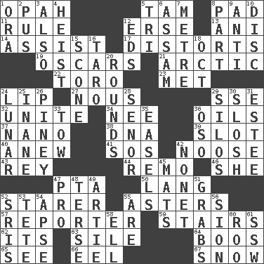 ACROSS 1. Brightly colored fish 5. Scottish cap 8. Writing tablet 11. Governing power 12. Celtic language 13. Cuckoo 14. Help 17. What propaganda does 19. Motion picture awards 21. Northern region 22. "Corrida" creature 23. Was introduced to 24. Mouth edge 27. Good sense 29. Compass dir. 32. Join together 34. Born 36. Lubricates 37. Billionth: prefix 38. Heredity factor (abbr.) 39. Notch 40. Afresh 41. Mayday 42. Trap for birds or small mammals 43. Marina Del _, California 44. San ____ (Riviera town) 46. A female animal or person 47. Parent Teacher Assoc. 50. Long (Scottish) 52. A viewer who gazes fixedly 55. Michaelmas daisies 57. News announcer 59. Flight of steps 62. It is 63. Drop; flow; fall 64. Expressions of contempt or scorn 65. Observe 66. Snakelike fish 67. Frozen precipitation DOWN 1. Mouth or opening 2. Festering 3. In addition 4. Robbery 5. Three (prefix) 6. Indian state 7. Distance measurement (Brit.) 8. Component 9. Against 10. Plate 12. Begley and Asner 15. Biscuitlike quick bread 16. Edible starchy tuberous root 18. Sep. follower 20. Periods in a boxing match 24. Type of eclipse 25. Empty; void 26. Abounding in pines 28. Sir (Sp.) 29. Grain storage towers 30. Make a splashing sound 31. First name in cosmetics 33. Pull behind 35. Artist's stands 36. Bear (Spanish) 42. Music written for nine 45. Floor coverings 47. Adept person 48. Laconic 49. Nick name for Arthur 51. Seizes 52. Indian titles of respect 53. Wig 54. Domed church section 55. "We ___ not amused" (Victoria) 56. The Jewish people; Israel 58. Pipe bend 60. Friend of Pooh 61. Compass dir.