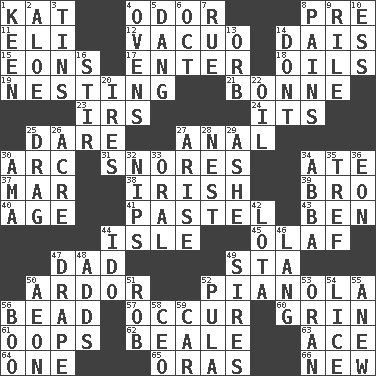 ACROSS 1. Krazy ___ of comics 4. Aroma 8. Before (prefix) 11. Connecticut Ivy Leaguer 12. In a vacuum (with "in") 14. Raised platform 15. Immeasurably long periods of time 17. Keyboard key 18. Petroleums 19. Snuggling 21. Maid-servant 23. Big collection agency 24. It is 25. Have the gumption 27. Of or related to the anus 30. Curve 31. Sounds asleep 34. Had dinner 37. Make imperfect 38. From or relating to Ireland 39. Sis' sibling 40. Grow older 41. Soft color 43. Benjamin's nick name 44. Capri or Wright 45. Norwegian king 47. June honoree 49. R.R. building 50. Zeal 52. Player piano 56. Necklace unit 57. Come to pass 60. Broad smile 61. I made a mistake 62. Memphis, Tenn. Street 63. Adept person 64. Single 65. Mouths or openings 66. ___ Haven, CT DOWN 1. Peachy ____! 2. _ vera 3. Metal containers 4. Baking chambers 5. Mild oath, euphamism for damn 6. Sep. follower 7. Regret 8. Aches 9. Cause heat under the collar 10. Curvy letter 13. Globe 14. Do not 16. Move through with a circular motion 20. Angers 22. Petroleum 25. To draw with force 26. 1/640 square mile 27. Get up 28. Egg locale 29. American tennis player Robert 30. Wet nurse (var.) 32. Cuts off 33. Spoken 34. Swedish rock group 35. Unclean, religiously 36. A really long time 42. Globular water bottle used in Asia 44. Wedding promise 46. Austrian-born American filmmaker Fritz 47. Window treatment 48. Does sums 49. Male parents of animals 50. Age 51. Director Reiner 52. Monetary unit of Botswana 53. NW Algerian seaport 54. Louse (plural) 55. Afresh 56. Surprise greeting 58. Corporate head (abbr.) 59. Automobile
