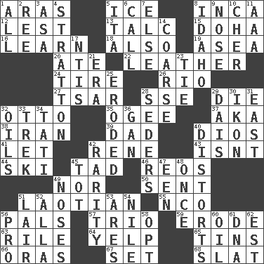 ACROSS 1. Ancient river in northeast Turkey 5. Frozen water 8. South American Indian 12. For fear that 13. Baby powder 15. Capital of the state of Qatar 16. Acquire or gain knowledge or skills 18. In addition 19. Toward the sea 20. Had dinner 22. Cordwainer's material 24. Become fatigued 26. River (Sp.) 27. Russian ruler of old 28. Compass dir. 29. Expire 32. Von Bismarck 35. Double curve, resembling the letter S 37. Alias (abbr.) 38. SW Asia republic 39. June honoree 40. "Vaya con ____" 41. Allow 42. French philosopher Descartes 43. Is not 44. What Jean-Claude Killy likes to do 45. Small boy 46. Vintage cars 49. Not either 50. Emitted 51. Of or relating to Laos or its people 55. Non-commissioned officer (abbr.) 56. Friends 57. Musical group of three 59. Wear away 63. Cause heat under the collar 64. Sharp bark 65. Canisters 66. Mouths or openings 67. Arrange properly for use 68. Narrow board DOWN 1. 100% 2. To separate or throw off 3. White ___ sheet 4. Ski resort town in Vermont 5. Call ___ day 6. Give a ring to 7. Otherwise 8. Potato state 9. Olfactory organ 10. "Mermaids" star 11. American Automobile Association (abbr.) 14. Rough 17. Nuclear Threat Initiatives 21. Period 23. Make a knot 25. Eaten away 28. Spring feasts 29. Raised platform 30. Image 31. Compass direction 32. Petroleums 33. Long journey 34. Jacques of French films 36. Separate the seeds from cotton 40. What propaganda does 42. Noteworthy scarcity 45. Small child 47. Car or cant ending 48. Single time 49. Olfactory organs 51. Den 52. Silent film actress Nazimova 53. Ancient Greek god of war 54. "Death on the ____" 56. Adept person 58. Elect 60. Petroleum 61. Heredity factor (abbr.) 62. Eastern Standard Time (abbr.)