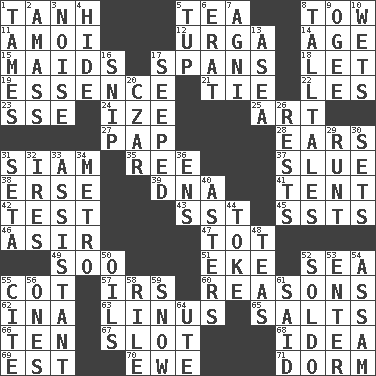 ACROSS 1. Hyperbolic tangent 5. Afternoon social gathering 8. Pull behind 11. Mine, in Marseilles 12. Capital and largest city of Mongolia 14. Personal question 15. Women servants 17. Connects, as a bridge 18. Allow 19. Substance 21. Neckwear 22. French article 23. Compass dir. 24. Ending with capital 25. Tate display 27. Infant food 28. Hearing organs 31. Thailand, formerly 35. Portuguese money of account (variant) 37. Change direction abruptly 38. Celtic language 39. Heredity factor (abbr.) 41. Portable shelter 42. Trial 43. Fast jet (abbr.) 45. Fast planes 46. SW Saudi Arabia district 47. Small child 49. "Barney Miller" actor Jack 51. Make supply last 52. Ocean 55. Small bed 57. Big collection agency 60. Thinks logically 62. _ tizzy (2 wds.) 63. "_ and Lucy" (Charlie Brown theme song) 65. Table seasonings 66. "___ Little Indians" 67. Slit 68. It may be bright or harebrained 69. Eastern Standard Time (abbr.) 70. She-sheep 71. Dormintory (informal) DOWN 1. Domesticates 2. Collect or gather 3. Annoying sound 4. Flintstone garb 5. Uncastrated adult male sheep 6. Part of Q.E.F. 7. Hindu god of fire 8. Baron Munchausen's specialties 9. Double curve, resembling the letter S 10. Moistens 13. At sea 16. Clip 17. Oozed 20. Russian ruler of old 26. Musical pauses 29. Undersized animal 30. Puts into a specified state 31. Bristle 32. Angers 33. Aide 34. Paris' subway 36. Followers of ems 40. Michaelmas daisies 44. Puff or smoke 48. Afternoon social gatherings 50. Lubricates 52. Twentieth part of a lira 53. Keyboard key 54. Indian state 55. Quote 56. Washington bills 58. Cause heat under the collar 59. Overwhelm 61. Alleged 64. Shoshoni