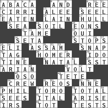 ACROSS 1. Phillipine bananalike plant 6. Plus 9. Portuguese money of account (variant) 12. High-altitude cloud 13. Toward shelter 14. Sew up the eyelids of hawks and falcons 15. Ingested 16. (Had) reclined 17. Frame or body of a ship 18. Ocean 19. Land 20. Immeasurably long periods of time 21. Not wild 23. Fr. "Yes" 24. Stalk of a moss capsule 25. Ceases 28. Biblical high priest 30. Indian state 34. Fastener 35. Label 36. Homing pigeon 38. Wedding promise 39. Prong on a fork 41. Relating to or accompanying birth 43. Fast jet (abbr.) 44. Believer in; advocate of (suffix) 46. Electrical Unit 48. Bear (Spanish) 49. False hair 50. Ship's personnel 51. Vintage cars 53. Compass dir. 56. Silvers or Donahue 57. "Corrida" creature 58. "_____ Recall" 60. Observes 61. Slanted text style (abbr.) 62. Get up 63. Big collection agency 64. Small child 65. Trials DOWN 1. Adept person 2. Prejudice 3. Johnson of "Laugh-In" 4. Make 5. The 18th letter of the Arabic alphabet 6. Jai _ 7. Famous astronaut Armstrong 8. Lair 9. One who advocates reunion 10. Snakelike fish 11. Pipe bend 13. _ vera 14. Yells 19. Box-office sellout 20. Greek goddess of the dawn 22. _ moment's notice (2 wds.) 24. Seigniories (variant) 26. Groovy apts. 27. Specific locale 28. Singer James 29. Den 31. Manchild 32. Wet nurse (var.) 33. Was introduced to 37. All-night dance parties 40. Artist's stands 42. Car dealer's back yard 45. Immediately 47. Poe poem 49. Utensil 50. "Mermaids" star 51. Printing process, for short 52. Part of Q.E.F. 54. Nuclear Threat Initiatives 55. Compass direction 56. 23rd letter of the Greek alphabet 57. Teat (slang) 58. Make lace 59. French article