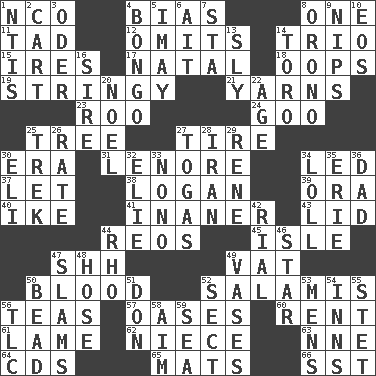 ACROSS 1. Non-commissioned officer (abbr.) 4. Prejudice 8. Single 11. Small amount or degree 12. Leaves out 14. Musical group of three 15. Angers 17. Brizilian seaport 18. I made a mistake 19. Slender, wiry 21. Tall tales 23. Friend of Pooh 24. Thick or sticky substance 25. Relationship diagram 27. Hoop that covers a wheel 30. Epoch 31. Poe poem 34. Directed 37. Allow 38. Utah city north of Ogden 39. Mouth or opening 40. Mamie's husband 41. Sillier 43. Flaplike covering 44. Vintage cars 45. Small island 47. Quiet! 49. Large container 50. Vital fluid 52. Deli grouping 56. Beverages made from leaves 57. Fertile tracts in a desert 60. Monthly bill 61. Unable to walk 62. Sibling's daughter 63. Compass dir. 64. Music discs 65. Floor coverings 66. Fast jet (abbr.) DOWN 1. Nuclear Threat Initiatives 2. Heavy open wagon 3. Baltic tributary 4. Beat drum 5. "If ____ say so..." 6. Small island 7. R.R. building 8. U. of Maine site 9. Pinches, bites 10. Greek goddess of the dawn 13. Secret 14. "Corrida" creature 16. Title for a man of rank and authority 20. Christmas carol 22. Grow older 25. Long journey 26. Pace 27. Ancient Roman robes 28. SW Asia republic 29. French philosopher Descartes 30. Biblical high priest 32. Writer Wiesel 33. Words to Nanette 34. Hang loosely or laxly 35. 4th largest of the Great Lakes 36. Male parent 42. Monetary unit of Yemen 44. 17th letter of the Greek alphabet 46. Play the lead 47. Shuts with force 48. Stockings 49. Flower holders 50. Necklace unit 51. Spanish title 52. Religious group 53. Not women's 54. Taverns 55. Proofreading order 56. Affectionate concern, for short 58. Direct toward a target or goal 59. Ocean