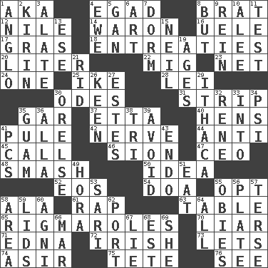 ACROSS 1. Alias (abbr.) 4. Mild oath 8. Naughty child 12. The longest river in the world 14. Make _____ (do battle with) 16. Ubangi River tributary 17. Pate de foie ____ 18. Pleas 20. 61 cubic inches 22. Russian fighter aircraft 23. Fish or hair follower 24. Single 25. Eisenhower's nickname 28. Flowery wreath 30. Lyric poems 31. Remove all contents or possession from 35. Slender fish 37. Singer James 40. Coop moms 41. Whimper 42. Effrontery 44. Opposed to 45. Give a ring to 46. The Jewish people; Israel 47. Corporate head (abbr.) 48. Box-office sellout 50. The content of cognition 52. Greek goddess of the dawn 54. ___ good deed 55. Choose 58. According to 61. Hit sharply and swiftly 63. Eating place 65. Complicated, petty procedures 70. One who doesn't tell the truth 71. Pulitzer Prize-winning author Ferber 72. From or relating to Ireland 73. Allows 74. SW Saudi Arabia district 75. Wig 76. Perceive with the eye DOWN 1. White American of non-Hispanic descent 2. Japanese brewing company 3. Having winglike extensions 4. She-sheep 5. Separate the seeds from cotton 6. Nonscientific branch of learning 7. Dormintory (informal) 8. Yet 9. It's straight from the horse's mouth 10. Toward shelter 11. Trial 13. Compass dir. 15. Famous astronaut Armstrong 19. Eras 21. To free from 26. Peachy ____! 27. _____ Park, CO 29. New York city 30. Threatening words 32. French philosopher Descartes 33. To the inside or interior of 34. 23rd letter of the Greek alphabet 35. Island territory of the United States 36. Silent film actress Nazimova 38. Three (prefix) 39. Prevent from happening 41. Personal Computers (abbr.) 43. Inside; within (prefix) 49. Israeli folk dance 51. Ingest 53. Indian skirt 55. Off-Broadway awards 56. Food holder 57. Laconic 58. Type of rug 59. Flaplike coverings 60. Hindu god of fire 62. Left side of a ship or aircraft 64. 100% 66. Spoil 67. Falsehood 68. Eastern Standard Time (abbr.) 69. A female animal or person