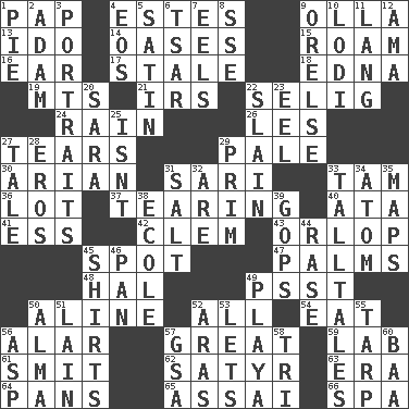 ACROSS 1. Infant food 4. _____ Park, CO 9. Water jar 13. Wedding promise 14. Fertile tracts in a desert 15. Wander aimlessly 16. Hearing organ 17. Showing deterioration from age 18. Pulitzer Prize-winning author Ferber 19. Mountains (abbr.) 21. Big collection agency 22. Former Milwaukee Brewers owner Bud 24. Water falling in drops from the sky 26. French article 27. Pulls apart 29. Light colored 30. Believer in; advocate of (suffix) 31. Indian skirt 33. Scottish cap 36. Car dealer's back yard 37. Lacerating 40. _ moment's notice (2 wds.) 41. Curvy letter 42. Clement's nick name 43. Lowest deck of a ship 45. Blemish 47. Insides of hands 48. Actor Linden 49. Inconspicuous attention getter 50. Place in a line 52. 100% 54. Erode 56. Having or resembling wings 57. Relatively large 59. Experiment locale 61. Stricken, poetically 62. Man with strong sexual desires 63. Period 64. Baking dishes 65. Slender Brazilian palm 66. Health resort DOWN 1. Sliced dessert 2. First man 3. Likenesses of persons 4. Greek goddess of the dawn 5. Smooth fabric 6. Russian ruler of old 7. Snakelike fish 8. Compass dir. 9. Threatening words 10. Farming town in central California 11. Long (Scottish) 12. Housemaid (var.) 20. "Two Mules for Sister ____" 22. Killed 23. Snakelike fish 25. Is not 27. Story 28. Greek god of love 29. Demure 31. Table seasoning 32. "We ___ not amused" (Victoria) 33. Baron Munchausen's specialties 34. Tiny particle 35. Atlas contents 38. Learning spot: Fr. 39. Republicans 44. To erase 45. Upper-body garments 46. Baking dish 49. Beach, in Buenos Aires 50. _ mater 51. (Had) reclined 52. Ancient river in northeast Turkey 53. Allows 55. Canvas cover 56. Cleo's killer 57. Girls' org. (abbr.) 58. Three (prefix) 60. Sound made by sheep