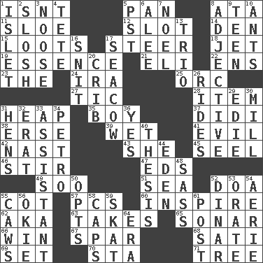 ACROSS 1. Is not 5. Baking dish 8. "One Day ___ Time" 11. A type of plum 12. Slit 14. Lair 15. Plunders 17. Guide 18. _ stream 19. Gist 21. Biblical high priest 22. Followers of ems 23. Definite Article 24. Lyricist Gershwin 25. The grampus (Milton) 27. Nervous spasm 28. A whole individual unit 31. Pile 35. Male child 37. "You Light Up My Life" star Conn 38. Celtic language 39. Dripping 41. Tending to cause great harm 42. Political cartoonist Thomas 43. A female animal or person 45. Stitch closed the eyes of (a falcon) 46. Commotion 47. Begley and Asner 49. "Barney Miller" actor Jack 51. Ocean 52. ___ good deed 55. Small bed 57. Personal Computers (abbr.) 60. Stimulate to action 62. Alias (abbr.) 63. Receives possession of 65. Echolocation 66. Victory 67. Practice fight 68. Suttee (variant) 69. Put into a specified state 70. R.R. building 71. Woody plant DOWN 1. Small island 2. Make a splashing sound 3. Trap for birds or small mammals 4. Wig 5. Pacific Standard Time (abbr.) 6. Toward shelter 7. Christmas carol 8. Descriptive word 9. Adolescent 10. Pismires 13. Musical group of three 16. In a ____ (agitated or irritated) 17. Manatee 20. Baby bed with high sides 26. Amusement-park features 29. Singer Brickell 30. Place where flour is made 31. Coop moms 32. Part of Q.E.F. 33. Aide 34. Stone: prefix 36. It is so 40. College paper 44. Paradise 48. Backtalk 50. Chooses 52. Middle Eastern gold or silver currency 53. Speak pompously 54. Nest on high 55. Crow sounds 56. Migrant worker of the '30s 58. Smile enhancers 59. Three-handed card game 61. Mail 64. Period