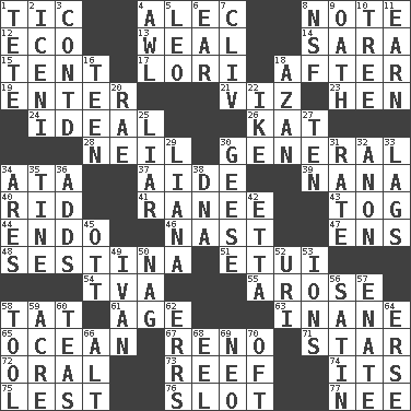 ACROSS 1. Nervous spasm 4. Actor Baldwin 8. Short letter 12. Environmental prefix 13. Welt 14. "Two Mules for Sister ____" 15. Portable shelter 17. Australian parrot (variant) 18. Following 19. Keyboard key 21. Namely 23. Layer 24. Standard of perfection 26. Krazy ___ of comics 28. Famous astronaut Armstrong 30. Commissioned military rank 34. _ moment's notice (2 wds.) 37. Helper 39. Grandmother 40. To free from 41. The wife of a rajah (variant) 43. Coat; cloak 44. Inside; within (prefix) 46. Political cartoonist Thomas 47. Followers of ems 48. French poetic form 51. Needle case 54. Federal power corp. 55. Came up 58. Make lace 61. Mature 63. Lacking in sense or substance 65. Sea 67. Western Nevada city 71. Play the lead 72. Spoken 73. Coral ridge 74. ___ a Wonderful Life 75. For fear that 76. Position in a hierarchy or organization 77. Born DOWN 1. Wig 2. Ancient Celtic tribe of eastern Britain 3. Continued (abbr.) 4. Leather borer 5. Lion 6. Hearing organ 7. 154 in Roman numerals 8. Overdraft (abbr.) 9. Pledge 10. Family _ (genealogy) 11. Merit 16. Adolescent 18. Muslim summons to prayer 20. Actress Charlotte 22. Mamie's mate 25. One who doesn't tell the truth 27. "___ Little Indians" 29. Climbing, woody, usually tropical vines 30. Honkers 31. Pace 32. At once, immediately (arch.) 33. Fails to keep up a pace 34. Ancient Greek god of war 35. Prong on a fork 36. Does sums 38. Heredity factor (abbr.) 42. Singer James 45. Baseball player Mel 49. _ the terrible 50. Tired old horse 52. RI univ. 53. Charged particles 56. Smooth fabric 57. Maternal 58. Instrument 59. Measure of real estate 60. Afternoon social gatherings 62. Blunders 64. Celtic language 66. The first octave above the treble staff 68. Snakelike fish 69. Modern: prefix 70. Often (poetically)