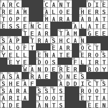 ACROSS 1. Curve 4. Patter 8. Expire 11. 480, 500 or 516 sheets of paper 13. Medicinal plant 14. Possessive pronoun 15. Drink excessively 16. Hindu Mythology: god of death 17. Blind as ____ 18. Center 21. Having winglike extensions 22. Pull into pieces 23. Scottish cap 25. Turn to the right 26. Plant excrement 29. File 13 32. High up in or into the air 34. Ewer handle 35. Sep. follower 38. Shout 39. Related on the mother's side 41. Greek god of love 43. Sight organ 44. Two (Sp.) 45. Talk or behave amorously 46. Roamer 50. Male child 51. White ___ sheet 54. Actress Charlotte 55. Singles 57. To gather and bind into a bundle 59. Inveterate users 63. "Two Mules for Sister ____" 64. Fast planes 67. Carrot, for example 68. Roberta Peters solo 69. A blast of a horn 70. Singer James 71. Binary compound 72. Pismires 73. Car or cant ending DOWN 1. Johnson of "Laugh-In" 2. Vintage cars 3. Balmoral and tarboosh 4. Device for capturing images 5. Wing 6. Or not 7. Afternoon social gathering 8. Debunk (Brit. slang) 9. Feeling or showing extreme anger 10. First name in cosmetics 12. Confront 14. Actor Linden 19. Remaining after all deductions 20. Automobile 21. Housemaid (var.) 23. Not this but _ 24. Measure of real estate 26. Declare 27. Toward shelter 28. More than one (prefix) 30. Gospel singer Marvin 31. Christmas carol 33. Soared 36. Baby bed with high sides 37. "Corrida" creature 39. Pulitzer Prize-winning author Ferber 40. Connecting point 42. Filthy place 45. Flintstone 47. Sandy's bark 48. Exposes to great heat 49. Conclusion 51. Slender Brazilian palm 52. Pottery fragment 53. Nest on high 56. The founder of a family 58. Auto club (abbr.) 60. ____ d'Azur (French Riviera) 61. Haul 62. Comedian Laurel of Laurel & Hardy 64. R.R. building 65. Male child 66. Small child