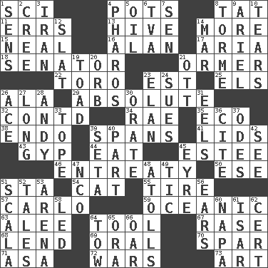 ACROSS 1. _-fi 4. Plant holders 8. Make lace 11. Blunders 13. Hub of activity 14. Greater amount 15. Be tempered by heat 16. ____ Jay Lerner 17. Operatic vocal solo 18. Legislator 21. Abalone 22. "Corrida" creature 23. Eastern Standard Time (abbr.) 25. Raised railways 26. Chicken ___ king 29. Utter; complete 32. Continued (abbr.) 34. Actress Charlotte 35. Environmental prefix 38. Inside; within (prefix) 39. Connects, as a bridge 41. Hats (slang) 43. Hustle 44. Ingest 45. First name in cosmetics 46. Plea 50. Compass dir. 51. R.R. building 54. Domesticated feline 55. Become fatigued 57. Monte _, Las Vegas Hotel/Casino 59. Pertaining to the sea 63. Toward shelter 64. Utensil 67. To erase 68. Grant temporary use of 69. Taken by mouth 70. Coast Guard woman 71. White ___ sheet 72. Armed conflicts 73. Tate display DOWN 1. Elected reps. 2. Algonquian 3. SW Asia republic 4. N Egypt peninsula 5. Petroleum 6. Federal power corp. 7. Elected rep. 8. Singer Mel 9. Satellite of Uranus 10. Separates forcefully 12. Narrow board 14. Impair 19. Frog relative 20. Globe 21. Baseball player Mel 23. Enthusiasm 24. Institutes legal proceedings 26. Adept person 27. Yearn 28. "60 Minutes" Commentator Rooney 30. Speak pompously 31. Snakelike fish 33. Drink excessively 36. Quote 37. Lyric poems 39. Bristle 40. Piece 42. Observe 45. Jane of fiction 47. Non-commissioned officer (abbr.) 48. Ringlike coral islands and reefs 49. Nervous spasm 51. Any of the three canals of the cochlea 52. Lies 53. Sports stadium 56. Hearing organs 58. Directed 60. California wine valley 61. Austrian river, tributary to the Danube 62. An absolute certainty 64. Pull behind 65. Mouth or opening 66. Rowing implement