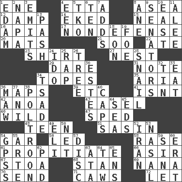 ACROSS 1. Compass dir. 4. Singer James 8. Toward the sea 12. Moist 14. Supplemented with great effort 15. Actress Patricia 16. Capital of Western Samoa 17. Unrelated to defense, as in spending 20. Floor protectors 21. "Barney Miller" actor Jack 22. Had dinner 23. Chest covering 27. A home for chicks 29. Have the gumption 31. Observe 34. Drinks excessively 35. Roberta Peters solo 36. Atlas contents 39. And so on (abbr.) 41. Is not 42. Small Philippine buffalo 43. Artist's stand 46. Rampant 47. Moved rapidly 48. Adolescent 51. Indian antelope 54. Slender fish 56. Directed 58. To erase 61. Appease 66. SW Saudi Arabia district 67. Portico 68. Comedian Laurel of Laurel & Hardy 69. Grandmother 70. Transmit 71. Crow sounds 72. Allow DOWN 1. Dutch treat 2. California wine valley 3. Gives off 4. Car or cant ending 5. Ring climax 6. "___ Little Indians" 7. Sums up 8. A saturated hydrocarbon 9. Elected representatives 10. 90 degrees 11. Toward shelter 13. Romantic infatuation 18. Period of immesurable duration 19. Enemy 24. Wedding promise 25. Reproach for some lapse or misdeed 26. Woody plant 28. Slow-paced one 30. _____ Park, CO 32. Shallow baking pan 33. Ingest 34. Sadhe (variant) 36. Opening into something insatiable 37. Cuckoo 38. Coward 40. Smile enhancers 44. Ocean 45. Begley and Asner 49. Connecticut Ivy Leaguer 50. Fish or hair follower 52. SW Asia republic 53. Rhinal 54. Global Positioning Systems (abbr.) 55. Johnson of "Laugh-In" 57. Flat circle 59. Trig term 60. Part of Q.E.F. 62. Writing tablet 63. _ moment's notice (2 wds.) 64. The 23rd letter of the Hebrew alphabet 65. Followers of ems