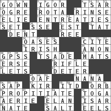 ACROSS 1. Woman's formal wear 5. Russian composer Stravinsky 9. Russian ruler of old 13. Legendary monster 14. Round or rotation of duties 15. Remove soap 16. Writer Wiesel 17. Pleas 19. Put into a specified state 20. Compass dir. 21. Eastern Standard Time (abbr.) 22. Make lace 23. Scratch 25. To riddle 26. Fertile tracts in a desert 30. Quote 34. From or relating to Ireland 35. At once, immediately (arch.) 36. Global Positioning Systems (abbr.) 39. Sadhe (variant) 42. Floor coverings 43. Celtic language 44. Firearm 46. Allows 47. Prevent from occurring 48. Clumsy lout 51. Nanny 54. Plant excrement 57. Apertif with cassis 58. It would 60. Globe 62. Conciliate 65. Ancient Roman robe 66. Nest on high 67. Flair 68. Austrian river, tributary to the Danube 69. Nathan's nickname 70. Table seasoning 71. Snakelike fish DOWN 1. Leaves 2. Stared 3. Compose 4. Born 5. Angers 6. Went 7. Baseball player Mel 8. More valued for its uncommonness 9. Teat (slang) 10. In a ____ (agitated or irritated) 11. Toward the sea 12. Take ten 15. Assign a rank or rating to 18. Compass dir. 20. Play the lead 24. Annoying sounds 27. Be seated 28. Double-curved letter 29. Pottery fragment 30. Device for capturing images 31. _ tizzy (2 wds.) 32. Small child 33. Followers of ems 36. Set 37. Before (prefix) 38. Fast jet (abbr.) 40. Pass on 41. Bank Draft (abbr.) 45. Grant temporary use of 48. Migrant worker of the '30s 49. Small island 50. Strips of potato fried in deep fat 52. Trap for birds or small mammals 53. Therefore, facetiously 54. Connect, as a bridge 55. Type of rug 56. Sweet dark-red dessert wine 58. Slanted text style (abbr.) 59. Portable shelter 61. Drinking establishments 63. Sliced dessert 64. According to 65. Make a knot