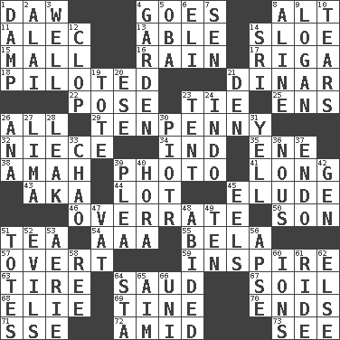 ACROSS 1. Fool 4. Moves 8. The first octave above the treble staff 11. Actor Baldwin 13. Competent 14. _ gin 15. Shopping center 16. Precipitation 17. Capital of Latvia 18. Manned the helm 21. Middle Eastern gold or silver currency 22. Airs 23. Make a knot 25. Followers of ems 26. 100% 29. 3-inch nail 32. Sibling's daughter 34. Indiana (abbr.) 35. Compass dir. 38. Housemaid 39. Picture 41. Protracted 43. Alias (abbr.) 44. Car dealer's back yard 45. Evade 46. Make much ado about nothing 50. Boy, to dad 51. Beverage made from leaves 54. Auto club (abbr.) 55. Actor Lugosi 57. Unconcealed 59. Stimulate to action 63. Become fatigued 64. Saudi Arabian king (1953-1964) 67. Land 68. Writer Wiesel 69. Prong on a fork 70. Extremities 71. Compass dir. 72. Among 73. Perceive with the eye DOWN 1. Moist 2. Mountain range southwest of Kyrgyzstan 3. Not ill 4. Place where plants grow 5. Chief or king in Benin or Nigeria 6. Connecticut Ivy Leaguer 7. Elected rep. 8. Place in a line 9. Utah city north of Ogden 10. Lacerates 12. Hoof sound 14. Indian title of respect (Mr.) 19. Carry 20. Compass dir. 21. Lair 23. Portable shelter 24. Southeast Asian peninsula 26. Santa ___, CA 27. Pale green bean 28. Path through which fluid escapes 30. Peter (Polish) 31. Shout 33. US Secretary of Labor Elaine L. _ 36. Horse sense 37. Inside; within (prefix) 39. Entreaty 40. Israeli folk dance 42. Commissioned mil. rank 45. Snakelike fish 47. Large container 48. Stayed 49. Nine, plus one 51. Hauls 52. Vices 53. Nest on high 56. Domed church section 58. To separate or throw off 60. Charged atoms 61. Travel on or in a vehicle 62. Otherwise 64. R.R. building 65. Direct toward a target or goal 66. University (slang)