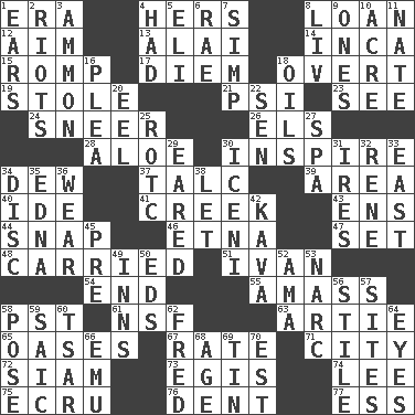 ACROSS 1. Epoch 4. Possessive pronoun 8. Grant temporary use of 12. Direct toward a target or goal 13. Mountain range southwest of Kyrgyzstan 14. South American Indian 15. Play 17. South Vietnam president (1954) 18. Unconcealed 19. Took without asking 21. Air pressure measure (abbr.) 23. Observe 24. Scornful expression 26. Raised railways 28. _ vera 30. Motivate 34. Morning condensation 37. Baby powder 39. Length times width 40. Binary compound 41. Small stream 43. Followers of ems 44. Fastener 46. Inactive volcano in Sicily 47. Put into a specified state 48. Borne 51. "Terrible" tsar 54. Conclusion 55. Collect or gather 58. Pacific Standard Time (abbr.) 61. Overdraft (abbr.) 63. Nick name for Arthur 65. Fertile tracts in a desert 67. Pace 71. Municipality 72. Thailand, formerly 73. Armor plate that protects the chest 74. Area sheltered from the wind 75. Shade of tan 76. Scratch 77. Double-curved letter DOWN 1. Hearing organs 2. Debaucheries 3. ID or VA city 4. Possessed 5. Biblical high priest 6. Actress Charlotte 7. Simple or foolish person 8. 54 in ancient Rome 9. Singles 10. Land measure 11. Nathan's nickname 16. Entreaty 18. Lubricates 20. Snakelike fish 22. Elected rep. 25. College mil. group 27. Health resort 29. Having ears or earlike features 30. Ancient Celtic tribe of eastern Britain 31. Angers 32. French philosopher Descartes 33. 90 degrees 34. Flat circle 35. Pulitzer Prize-winning author Ferber 36. Put on (as clothing) 38. Allow 42. Polynesian shrub of the pepper family 45. Before (prefix) 49. Restaurants 50. Begley and Asner 52. Wet nurse (var.) 53. Drug cop 56. Vertical member of a panel or frame 57. Locates 58. Introduce or present, as a question 59. Ketch in the Levant 60. Russian ruler of old 62. Flintstone 64. Snake ____ (dice throw) 66. Australian flightless bird 68. Mature 69. Shallow baking pan 70. Eastern Standard Time (abbr.)