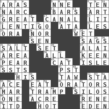 ACROSS 1. Ancient river in northeast Turkey 5. Compass dir. 8. Nine, plus one 11. Drug cop 12. Soap units 14. Tate display 15. Relatively large 17. Lessep's creation 18. Cards in a Roman deck? 19. Small, flat, pigmented spot on the skin 21. _ moment's notice (2 wds.) 22. French article 23. Mouth or opening 24. Not either 25. Soggy 27. Elected rep. 28. Droops 31. Table seasoning 35. Put into a specified state 37. Jai _ 38. Length times width 39. Everything 41. Peachy ____! 42. Lightbulb-shaped fruit 43. Domesticated feline 45. Capri or Wright 46. Fast planes 47. Pacific Standard Time (abbr.) 49. Part of HMS, perhaps 51. The 23rd letter of the Hebrew alphabet 52. R.R. building 55. Adept person 57. Consume 60. Speakers 62. Make imperfect 63. _____ steamer (cargo ship) 65. Grain storage towers 66. Single 67. 43,560 square feet 68. French philosopher Descartes 69. It would 70. Being at a high temperature 71. Paradise DOWN 1. White American of non-Hispanic descent 2. More valued for its uncommonness 3. Sports stadium 4. Get outta here! 5. Basketball assoc. 6. Grandmother 7. Part of Q.E.F. 8. Baron Munchausen's specialties 9. One of the Great Lakes 10. Nuclear Threat Initiatives 13. Cole _ (cabbage dish) 16. Canisters 17. Pupil covering 20. Moves 26. 1973 Nobel Price Winner (Physics) Leo 29. Highlander 30. Trig term 31. Plant excrements 32. Ancient Greek god of war 33. Resembling or made to resemble leather 34. Tarsus (plural) 36. Affectionate concern, for short 40. Portable computer 44. Russian ruler of old 48. It was, poetically 50. Stalk of a moss capsule 52. Having a sole or soles 53. Heavy duty weighing machine 54. NE Netherlands city 55. Mine, in Marseilles 56. Patter 58. Bowlike part 59. Edible starchy tuberous root 61. Become fatigued 64. Was introduced to