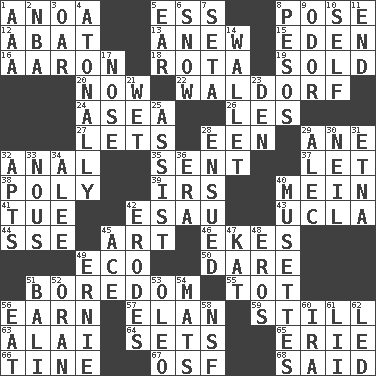 ACROSS 1. Small Philippine buffalo 5. Double-curved letter 8. Introduce or present, as a question 12. Blind as ____ 13. Afresh 15. Genesis locale 16. Composer Copland 18. Roll call or roster of names 19. Disposed of to a purchaser 20. At this time 22. Apple salad 24. Toward the sea 26. French article 27. Allows 28. Car or cant ending 29. A saturated hydrocarbon 32. Of or related to the anus 35. Posted 37. Allow 38. More than one (prefix) 39. Big collection agency 40. Count _ (2 wds.) 41. Third day of the wk. 42. Son of Isaac 43. Southern CA. univ. 44. Compass dir. 45. Tate display 46. Supplements with great effort 49. Environmental prefix 50. Have the gumption 51. Mood resulting from idleness 55. Small child 56. Merit 57. Flair 59. Free of sound 63. Mountain range southwest of Kyrgyzstan 64. Puts into a specified state 65. 4th largest of the Great Lakes 66. Prong on a fork 67. Order of Saint Francis (abbr.) 68. Expressed in words DOWN 1. American Automobile Association (abbr.) 2. Basketball assoc. 3. Boat paddle 4. Lacking a tonal center or key 5. Ewer handle 6. Frozen precipitation 7. Stalk of a moss capsule 8. Mexican monetary units 9. Aroma 10. Itself 11. Conclude 14. Place for singles 17. Olfactory organ 21. Soggy 23. Lair 25. Aid 28. Took place subsequently 29. Actor Baldwin 30. Famous astronaut Armstrong 31. Inactive volcano in Sicily 32. Flats, for short 33. Horse sense 34. Toward shelter 36. Period 40. French bagpipes 42. Eats (away) 45. Adept person 47. Krazy ___ of comics 48. Greek god of love 49. Bert's buddy 51. Indonesian resort city 52. Northwest Algerian city 53. Margarine 54. Floor protectors 56. Consume 58. Overdraft (abbr.) 60. Retirement account (abbr.) 61. Cards in a Roman deck? 62. Directed