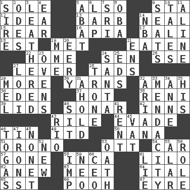 ACROSS 1. Flatfish 5. In addition 9. R.R. building 12. The content of cognition 13. Sharp remark 14. Actress Patricia 15. Located in or toward the back 16. Capital of Western Samoa 17. Indonesian resort city 18. Eastern Standard Time (abbr.) 19. Was introduced to 21. Eroded 22. Residence 24. Elected rep. 26. Compass dir. 27. Crowbar 28. Small boys 29. Greater amount 30. Entertaining tales 32. Nursemaid 36. Genesis locale 37. Being at a high temperature 38. Painter Guido (1575-1642) 39. Hats (slang) 40. Echolocation 42. Restaurants 43. Cause heat under the collar 44. Elude 46. Shallow baking pan 49. It would 50. Nanny 51. U. of Maine site 53. Baseball player Mel 54. Auto 57. Went 58. South American Indian 61. _ and Stitch 62. Afresh 63. Confront 64. Slanted text style (abbr.) 65. Fast jet (abbr.) 66. "Silly old bear" 67. Jane of fiction DOWN 1. Father 2. Lyric poems 3. Tough but pliablecoriaceous 4. Hearing organ 5. Blind as ____ 6. Infant locale 7. _ Lanka 8. Chief or king in Benin or Nigeria 9. Theater features 10. Falsehoods 11. Place in a line 14. Basketball assoc. 19. Madame (abbr.) 20. Suggestive of the supernatural 21. Followers of ems 23. Baking chambers 24. Before Barbara or Clara 25. Begley and Asner 27. Farming town in central California 28. Heavy duty weighing machine 29. Cartoonist voice _ Blanc 31. Hold, grip (Informal) 32. Believer in; advocate of (suffix) 33. Ananias' fault 34. Queen of England 1702-14 35. Part of HMS, perhaps 40. Be seated 41. Monthly bill 43. _ de Janeiro 45. Large container 46. Ancient Roman robes 47. Removes the wrinkles 48. Music written for nine 52. ___ Haven, CT 53. Pledge 55. Having or resembling wings 56. Hero or heavy, e.g. 58. Naughty child 59. Modern: prefix 60. Corporate head (abbr.) 61. Untruth
