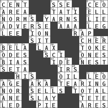 ACROSS 1. Penny 5. Compass dir. 8. Corporate head (abbr.) 11. Type of rug 12. Jacques of French films 14. Pipe bend 15. Typical models 17. Entertaining tales 18. Untruth 19. Contrary to your interests or welfare 21. American Automobile Association (abbr.) 22. Part of a journey 23. Area sheltered from the wind 24. Electrically charged atom 25. Strike 27. Be seated 28. "Mermaids" star 31. Actor Lugosi 35. Not strict 37. Puff or smoke 38. Lyric poems 39. _-fi 41. Washington bills 42. Prejudice 43. Binary compound 45. Egg locale 46. Bristle 47. Big collection agency 49. Part of HMS, perhaps 51. Lubricate 52. Lion 55. Personal question 57. Alias (abbr.) 60. Rending 62. Not either 63. Makes a sale 65. Add up to 66. One (Scot) 67. Kill 68. False hair 69. Directed 70. Sliced dessert 71. Ancient Greek god of war DOWN 1. Lessep's creation 2. Eat (away) 3. Effrontery 4. Not wild 5. R.R. building 6. "Two Mules for Sister ____" 7. Inactive volcano in Sicily 8. Portable communications device 9. Writer Wiesel 10. Cassini of fashion 13. Austrian river, tributary to the Danube 16. Indian titles of respect 17. Gossips 20. The visible part of the earth's surface 26. 13-14th century defensive garment 29. Supplements with great effort 30. Remainder 31. Moves up and down 32. Singer Brickell 33. Resembling or made to resemble leather 34. Slender Brazilian palm 36. One more than ninety 40. Foolish or stupid persons 44. 4th largest of the Great Lakes 48. Narrow board 50. Backtalk 52. 61 cubic inches 53. Related on the mother's side 54. Stares at amorously 55. Of or related to the anus 56. Went 58. Seaweed 59. Mountain range southwest of Kyrgyzstan 61. Roll call or roster of names 64. Potassium hydroxide