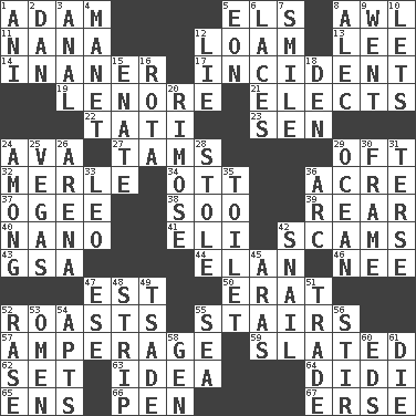 ACROSS 1. First of billions? 5. Raised railways 8. Leather borer 11. Nanny 12. Rich soil 13. Area sheltered from the wind 14. More lacking in sense or substance 17. Happening 19. Poe poem 21. Opts 22. Jacques of French films 23. Elected rep. 24. Actress Gardner 27. Scottish caps 29. Often (poetically) 32. Haggard of country music 34. Baseball player Mel 36. 43,560 square feet 37. Double curve, resembling the letter S 38. "Barney Miller" actor Jack 39. Located in or toward the back 40. Billionth: prefix 41. Connecticut Ivy Leaguer 42. Fraudulent business schemes 43. Girls' org. (abbr.) 44. Enthusiasm 46. Born 47. Eastern Standard Time (abbr.) 50. Part of Q.E.F. 52. Ridicules or criticizes harshly 55. Flight of steps 57. Electrical Measurement 59. Scheduled 62. Put into a specified state 63. It may be bright or harebrained 64. "You Light Up My Life" star Conn 65. Followers of ems 66. Fenced enclosure 67. Celtic language DOWN 1. Black tropical American cuckoo 2. One of the 12 tribes of Israel 3. Of or related to the anus 4. French painter Edouard 5. A really long time 6. Shoestrings 7. Grin 8. Actor Baldwin 9. Left 10. Allows 12. Untruth 15. Maternal 16. Round or rotation of duties 18. Lair 20. Full of chinks, cracks, or crevices 24. Amid 25. Viva Las _ 26. Sports stadium 28. Fur scarf 29. Sea 30. Movie unit 31. Laconic 33. Lion 35. Bathroom plumbing fixture 36. Curve 42. Slow-paced one 45. Ancient river in northeast Turkey 47. Compass dir. 48. Remove all contents or possession from 49. Sadhe (variant) 51. Swap 52. Raze (variant) 53. Sign of things to come 54. Flats, for short 55. Ocean 56. Move through with a circular motion 58. Commissioned military rank (abbr.) 60. Begley and Asner 61. Pass on