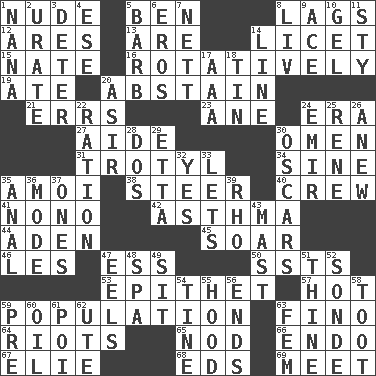 ACROSS 1. Unadorned 5. Benjamin's nick name 8. Falls behind 12. Ancient Greek god of war 13. "We ___ not amused" (Victoria) 14. It is permitted: Lat. 15. Nathan's nickname 16. Happening in regular succession 19. Had dinner 20. Refrain by choice 21. Blunders 23. One (Scot) 24. Epoch 27. Assistant 30. Presage 31. TNT 34. Trig term 35. Mine, in Marseilles 38. Navigate 40. Group working together 41. Words to Nanette 42. Respiratory problem 44. Arabian gulf 45. Fly high 46. French article 47. Double-curved letter 50. Fast planes 53. Curse 57. Being at a high temperature 59. Census information 63. A pale, very dry sherry 64. Debaucheries 65. Lower and raise head in agreement 66. Inside; within (prefix) 67. Writer Wiesel 68. Begley and Asner 69. Confront DOWN 1. Nanny 2. A salt of uric acid 3. Prevent from occurring 4. Compass dir. 5. Sharp remark 6. Greek god of love 7. Remaining after all deductions 8. 54 in ancient Rome 9. Adept person 10. Set 11. Filthy place 14. Actor's bit 17. Auto club (abbr.) 18. Shallow baking pan 20. SW Saudi Arabia district 22. Food allowance for one day 24. Independent ruler or chieftain 25. French philosopher Descartes 26. Afresh 28. Two (Sp.) 29. Singer James 30. Motion picture awards 32. Affirmative reply 33. Allows 35. Of or related to the anus 36. Method 37. Washington bills 39. 17th letter of the Greek alphabet 43. Vertical spar for supporting sails 47. Snakelike fish 48. Health resort 49. Be seated 51. One or ones belonging to thee 52. Something which is sent 54. Prong on a fork 55. Parka part 56. Conclusions 58. A blast of a horn 59. Before (prefix) 60. Lubricate 61. Luau course 62. Shoshoni 63. Opposite of masc.