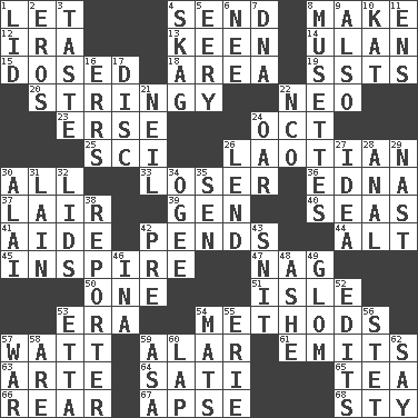 ACROSS 1. Allow 4. Transmit 8. Cause to be 12. Lyricist Gershwin 13. Peachy ____! 14. Uhlan (variant) 15. Administered medicine 18. Length times width 19. Fast planes 20. Slender, wiry 22. Modern: prefix 23. Celtic language 24. Sep. follower 25. _-fi 26. Of or relating to Laos or its people 30. 100% 33. Failure 36. Pulitzer Prize-winning author Ferber 37. Den 39. Commissioned military rank (abbr.) 40. Oceans 41. Helper 42. Depends 44. Keyboard modifier key 45. Motivate 47. Tired old horse 50. Single 51. Capri or Wright 53. Epoch 54. Modes 57. Electrical Unit 59. Having or resembling wings 61. Gives off 63. Johnson of "Laugh-In" 64. Suttee (variant) 65. Afternoon social gathering 66. Tail end 67. Domed church section 68. Filthy place DOWN 1. Hat (slang) 2. Greek god of love 3. Clothes sense 4. Heroin 5. Suggestive of the supernatural 6. Born 7. Heredity factor (abbr.) 8. French bagpipes 9. In addition 10. Krazy ___ of comics 11. Followers of ems 16. Blunders 17. Flat circle 21. Famous astronaut Armstrong 22. Non-commissioned officer (abbr.) 24. Rowing implement 26. Grant temporary use of 27. It may be bright or harebrained 28. Of or related to the anus 29. Political cartoonist Thomas 30. Jai _ 31. (Had) reclined 32. Flaplike coverings 34. Double curve, resembling the letter S 35. Elected rep. 38. Newsperson 42. Before (prefix) 43. In a ____ (agitated or irritated) 46. _ tizzy (2 wds.) 48. American tennis player Robert 49. Take by theft 52. Prepares for publication 53. Singer James 54. Floor coverings 55. 4th largest of the Great Lakes 56. Proofreading order 57. Armed conflict 58. "We ___ not amused" (Victoria) 59. White ___ sheet 60. Infant locale 62. Declare