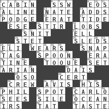 ACROSS 1. Small house or cottage 6. Compass dir. 9. Greek goddess of the dawn 12. Place in a line 13. Nathan's nickname 14. Sums up 15. Porridge 16. Part of Q.E.F. 17. Event that recurs at intervals 18. Compass dir. 19. Agitate 20. Tennis shots 21. In a ____ (agitated or irritated) 23. Pipe bend 24. Proofreading order 25. Bobsleighs 28. Connecticut Ivy Leaguer 30. Erodes 34. Fastener 35. Label 36. Soup utensil 38. Period 39. Prong on a fork 41. Woman's close-fitting hat 43. Arrange properly for use 44. Believer in; advocate of (suffix) 46. Raised platform 48. Bear (Spanish) 49. Certainty 50. Ship's personnel 51. Opinion 53. Part of HMS, perhaps 56. Silvers or Donahue 57. Blemish 58. Monte _, Las Vegas Hotel/Casino 60. Perceives with the eye 61. Filth; sediment 62. Sea 63. Big collection agency 64. Make lace 65. Clothes sense DOWN 1. Head covering 2. _ vera 3. Auction offers 4. Consume 5. Born 6. Indian skirt 7. Play the lead 8. Dripping 9. The property of being fit to eat 10. Likelihood 11. Compass dir. 13. Remaining after all deductions 14. Ringlike coral islands and reefs 19. Settings 20. French article 22. ___ Haven, CT 24. Seigniories (variant) 26. Have the gumption 27. Argument over a trivial matter 28. Singer James 29. Den 31. Fitting 32. Friend of Pooh 33. "Barney Miller" actor Jack 37. Unadorned figures 40. Artist's stands 42. Ewer handle 45. At this time 47. New York city 49. Quote 50. "Mermaids" star 51. Capital of Western Samoa 52. Electrical Unit 54. Angers 55. Narrow board 56. 23rd letter of the Greek alphabet 57. Fast jet (abbr.) 58. Small bed 59. Single