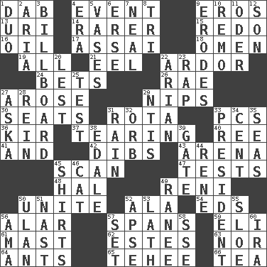 ACROSS 1. Apply (a substance) by light strokes 4. Happening 9. Greek god of love 13. RI univ. 14. Less widely known 15. Make new 16. Lubricate 17. Slender Brazilian palm 18. Sign of something about to happen 19. 100% 21. Snakelike fish 22. Zeal 24. Antes 26. Actress Charlotte 27. Came up 29. Cuts off 30. Theater features 31. Round or rotation of duties 33. Personal Computers (abbr.) 36. Apertif with cassis 37. Separating forcefully 40. Portuguese money of account (variant) 41. Plus 42. Claim 43. Sports stadium 45. Examine minutely or intensely 47. Trials 48. Actor Linden 49. Painter Guido (1575-1642) 50. Join together 52. Wing 54. Begley and Asner 56. Having or resembling wings 57. Connects, as a bridge 59. Biblical high priest 61. Vertical spar for supporting sails 62. _____ Park, CO 63. Not either 64. Pismires 65. Giggle 66. Beverage made from leaves DOWN 1. Superhero pair 2. Operatic vocal solo 3. Big road sign 4. Period 5. Flower holders 6. Celtic language 7. Anneal 8. Three (prefix) 9. Eats (away) 10. San ____ (Riviera town) 11. River in Europe 12. Boy, to dad 20. For fear that 22. Believer in; advocate of (suffix) 23. Hit sharply and swiftly 25. Trial 27. "____ silly question..." 28. It's straight from the horse's mouth 29. Nuclear Threat Initiatives 31. Precipitation 32. Globe 33. Elected leader of a country 34. Penny 35. Oceans 38. Peak District village in England 39. Yard entry 44. French philosopher Descartes 45. Upper-body garments 46. Domesticated feline 49. Indian princess (variant) 50. Uhlan (variant) 51. Political cartoonist Thomas 52. Domed church section 53. Thin strip of wood or metal 55. _ gin 56. Nanny (var.) 57. Put into a specified state 58. Compass dir. 60. Lyricist Gershwin