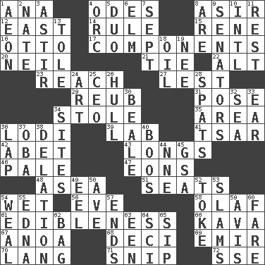 ACROSS 1. Santa ___, CA 4. Lyric poems 8. SW Saudi Arabia district 12. Compass direction 14. Court order 15. French philosopher Descartes 16. Von Bismarck 17. Parts 20. Famous astronaut Armstrong 21. Make a knot 22. The first octave above the treble staff 23. Arrive at 27. For fear that 29. Reuben's nickname 31. Airs 34. Took without asking 35. Length times width 36. Farming town in central California 39. Experiment locale 41. Russian ruler of old 42. Collude with 43. Yearns 46. Diluted with white 47. Immeasurably long periods of time 48. At sea 51. Theater features 54. Soggy 56. Night before a holiday 58. Norwegian king 61. The property of being fit to eat 66. Polynesian shrub of the pepper family 67. Small Philippine buffalo 68. Tenth: prefix 69. Independent ruler or chieftain 70. Long (Scottish) 71. Clip 72. Compass dir. DOWN 1. Period of immesurable duration 2. Nathan's nickname 3. Moving about 4. The grampus (Milton) 5. Superhero pair 6. Shade tree 7. Back-to-school mo. 8. "We ___ not amused" (Victoria) 9. Legislators 10. International (abbr.) 11. Relief 13. Lacquered or enameled metalware 18. Lubricate 19. Born 24. Tate display 25. Corporate head (abbr.) 26. Frame or body of a ship 28. Arguments over trivial matters 30. Calif. Air Force Base 32. Ocean 33. Ewer handle 34. Settings 36. Infant locale 37. Chief or king in Benin or Nigeria 38. Accusation by an informer 40. Scornful sounds 44. Compass dir. 45. Girls' org. (abbr.) 49. Snakelike fish 50. "___ Maria" 52. Casino tip 53. Shuts with force 54. Welt 55. Pulitzer Prize-winning author Ferber 57. Conclusions 59. Deliberation 60. Conductor's collection 62. Container for groceries 63. Car or cant ending 64. _-fi 65. Small drink