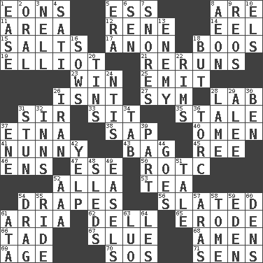 ACROSS 1. Immeasurably long periods of time 5. Double-curved letter 8. "We ___ not amused" (Victoria) 11. Length times width 12. French philosopher Descartes 14. Snakelike fish 15. Table seasonings 17. Soon (poet.) 18. Expressions of contempt or scorn 19. American author Paul (1891-1958) 21. Summer TV shows 23. Acquire through effort 25. Give off 26. Is not 27. Symbol (abbr.) 28. Experiment locale 31. Title for a knight 33. Be seated 35. Showing deterioration from age 37. Inactive volcano in Sicily 38. Plant excrement 40. Sign of something about to happen 41. Pet term 43. Paper or plastic container 45. To sift 46. Followers of ems 47. Compass dir. 50. College mil. group 52. Silent film actress Nazimova 53. Afternoon social gathering 54. Window treatments 56. Scheduled 61. Operatic vocal solo 62. Small valley 65. Wear away 66. Bit 67. Turn sharply 68. So be it 69. Grow older 70. Distress signal 71. Elected reps. DOWN 1. Comfort 2. Relating to the mouth 3. 1994 drama film starring Jodie Foster 4. Suttee (variant) 5. Period 6. Elected rep. 7. Sounds asleep 8. A really long time 9. Vintage cars 10. Raised railways 13. Foe 16. Sty mamas 18. On the contrary 20. Canisters 22. Basketball hoops 24. Nuclear Threat Initiatives 26. SW Asia republic 28. Unable to walk 29. Toward shelter 30. Benjamin's nick name 31. Astound 32. Lodging establishments 34. Bar bill 36. Torque (variant) 37. Compass dir. 39. Piece 42. Sharp bark 44. Leaves 48. Bobsleighs 49. Artist's stands 51. Lie 52. Auto club (abbr.) 54. To draw with force 55. Travel on or in a vehicle 57. Ancient river in northeast Turkey 58. Heavy book 59. Paradise 60. Hiding places for outlaws 61. "One Day ___ Time" 63. Nilotic language 64. French article