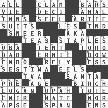 ACROSS 1. Everything 4. Dollar (slang) 8. Soap units 12. Compete 13. Tenth: prefix 14. Of or related to the anus 15. Taverns 17. Stitch closed the eyes of (a falcon) 18. Nick name for Arthur 19. Costumes for special activities 21. French article 23. Working for oneself (abbr.) 24. Contemptuous expression 26. Alias (abbr.) 28. Afternoon social gatherings 30. Paper fasteners 34. Chief or king in Benin or Nigeria 37. Portable shelter 39. "Corrida" creature 40. June honoree 41. Bert's buddy 43. Arrow shooter 44. Inside; within (prefix) 46. Have confidence or faith in 47. Curvy letter 48. French poetic form 51. Snakelike fish 54. Federal power corp. 55. Before Barbara or Clara 58. Before (prefix) 61. Ripen 63. A tree used for making furniture 65. Utah city north of Ogden 67. Brightly colored fish 71. Carryall 72. Independent ruler or chieftain 73. Nathan's nickname 74. Or not 75. Domed church section 76. Connect, as a bridge 77. Followers of ems DOWN 1. Opinion 2. "_ and Lucy" (Charlie Brown theme song) 3. Soviet premier 1918-24 4. Music discs 5. Area sheltered from the wind 6. Adept person 7. Place where flour is made 8. Long, evenly shaped piece 9. Opposed to 10. Water falling in drops from the sky 11. Downhill vehicle 16. Proofreading order 18. "____ silly question..." 20. Observe 22. Erode 25. Pace 27. Fitting 29. Father Junipero _ 30. Vertical member of a panel or frame 31. Ear part 32. Greek god of love 33. Sty mamas 34. Lyric poems 35. Object of repulsion 36. Does sums 38. Compass dir. 42. Sight organs 45. Baseball player Mel 49. _ the terrible 50. Tired old horse 52. Experiment locale 53. In a ____ (agitated or irritated) 56. Heavy duty weighing machine 57. 13-14th century defensive garment 58. Entreaty 59. Frolic 60. The front part of a cuirass 62. Immeasurably long periods of time 64. Possessive pronoun 66. "We ___ not amused" (Victoria) 68. Infant food 69. "One Day ___ Time" 70. Layer