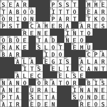 ACROSS 1. Wither 5. Inconspicuous attention getter 9. Madame (abbr.) 12. Off limits 14. "Tell ____ the Marines!" 15. Hearing organ 16. Constellation of myth 17. Piece 18. Ring climax 19. Pacific Standard Time (abbr.) 20. Device for capturing images 23. Ancient Greek god of war 24. French philosopher Descartes 25. To the inside or interior of 27. Mitch Miller's instrument 30. Small boy 32. Modern: prefix 33. Libertine 34. Groove 36. Australian flightless bird 38. Drinking establishment 39. Wedding promise 40. Tax preparer (abbr.) 43. Insect wing 46. The front part of a cuirass 48. Having or resembling wings 49. ___ a Wonderful Life 51. Connecticut Ivy Leaguer 52. Patter 53. Actor Baldwin 54. Otherwise 56. Billionth: prefix 58. Speaker 61. Again 64. One (Scot) 65. Mountain range 66. Empty; void 68. Parent Teacher Association (abbr.) 69. Stalk of a moss capsule 70. Something which is sent 71. Wind 72. Paradise 73. Vintage cars DOWN 1. Obstruct or block passage 2. Hearing organs 3. "This won't hurt ____!" 4. Friend of Pooh 5. Corncob 6. Play the lead 7. Put through a sieve 8. Small child 9. Paris' subway 10. Cause to be 11. Greek god of love 13. Single time 21. Pismires 22. Ear of corn 23. Tiny particle 24. To riddle 26. Born 27. Globe 28. Sound made by sheep 29. Gumbo ingredient 31. Evade 35. Bathroom plumbing fixture 37. Southern CA. univ. 41. Baking dish 42. Tate display 44. _ and Stitch 45. Had dinner 47. Grain storage tower 48. Adept person 50. Tallied 53. Approach 55. Indian titles of respect 56. California wine valley 57. Opposed to 59. Assign a rank or rating to 60. ____ Jay Lerner 61. Object of repulsion 62. Southeast Asian peninsula 63. Perceives with the eye 65. Purpose 67. Or not