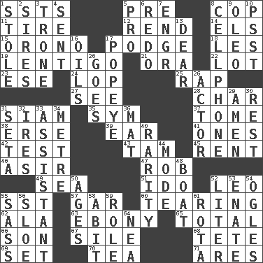 ACROSS 1. Fast planes 5. Before (prefix) 8. Police officer (slang) 11. Become fatigued 12. Tear apart 14. Raised railways 15. U. of Maine site 17. Puddle 18. French article 19. Small, flat, pigmented spot on the skin 21. Mouth or opening 22. Car dealer's back yard 23. Compass dir. 24. Chop off 25. Strike 27. Observe 28. Burn to charcoal 31. Thailand, formerly 35. Symbol (abbr.) 37. Heavy book 38. Celtic language 39. Ewer handle 41. Washington bills 42. Trial 43. Scottish cap 45. Monthly bill 46. SW Saudi Arabia district 47. Director Reiner 49. Ocean 51. Wedding promise 52. Lion 55. Fast jet (abbr.) 57. Slender fish 60. Pulling into pieces 62. Insect wing 63. Black 65. "_____ Recall" 66. Male offspring 67. Drop; flow; fall 68. Wig 69. Arrange properly for use 70. Beverage made from leaves 71. Ancient Greek god of war DOWN 1. Fur scarf 2. Fathers 3. Marketplace scale 4. Posted 5. Adept person 6. Redecorate 7. Engineer (abbr.) 8. Portable communications device 9. Butter sub 10. Inconspicuous attention getter 13. Letter starter 16. Lubricates 17. Wimpy's pal 20. Travels 26. Thespian 29. So be it 30. Relief 31. Stalk of a moss capsule 32. Angers 33. Aide 34. Distance measurement (Brit.) 36. Floor protector 40. Noteworthy scarcity 44. Method 48. Water vessel 50. Eras 52. 61 cubic inches 53. Maternal 54. Stares at amorously 55. Backtalk 56. _ gin 58. "This won't hurt ____!" 59. Hero or heavy, e.g. 61. Round or rotation of duties 64. Teachers' org.