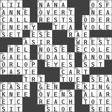 ACROSS 1. Cards in a Roman deck? 4. Nanny 8. Order of Saint Francis (abbr.) 11. Singer Murray 13. Unconcealed 15. Teachers' org. 16. Give a ring to 17. Musical pauses 18. River in Europe 19. Foe 21. Beverage made from leaves 22. Short-tailed, large-bodied rat 23. Put into a specified state 24. Compass dir. 27. Actress Charlotte 29. SW Saudi Arabia district 30. Take or capture by force 34. Cartoonist voice _ Blanc 36. Olfactory organ 39. Learning spot: Fr. 40. Highlander 41. Peak District village in England 43. Soon (poet.) 44. Lowest deck of a ship 46. Snake ____ (dice throw) 47. Fast jet (abbr.) 48. Thick mixture 49. Haul 51. Three (prefix) 53. Third day of the wk. 54. Ocean 57. Comfort 60. Commissioned mil. rank 63. Supplementing with great effort 65. Leg joint 66. Baking chambers 69. Having or resembling wings 70. And so on (abbr.) 71. Arrive at 72. Haul 73. Be seated 74. _ gin 75. Perceive with the eye DOWN 1. Shoestrings 2. Lacking in sense or substance 3. An arm off of a larger body of water 4. Or not 5. "___ Maria" 6. Egg locale 7. Johnson of "Laugh-In" 8. Southwest Nigerian state 9. Sew up the eyelids of hawks and falcons 10. Conductor's collection 12. Shade tree 14. Russian ruler of old 18. Cloudy 20. It is so 25. Trig term 26. Eat (away) 28. Deep reverence 29. One to whom something is allotted 31. Immeasurably long periods of time 32. Position in a hierarchy or organization 33. Nine, plus one 34. Hindu Mythology: god of death 35. Snakelike fish 37. Declare 38. Choose 40. Grand Old Party 42. He sold his birthright 45. For each 50. To sift 52. Composer Stravinsky 54. Grain storage towers 55. Maternal 56. Match 57. Supplements with great effort 58. Against 59. Religious group 61. Nights before holidays 62. Anneal 64. Krazy ___ of comics 67. Non-commissioned officer (abbr.) 68. A female animal or person
