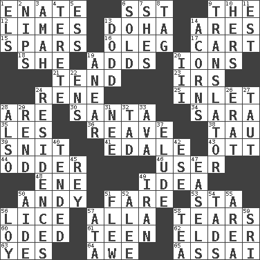 ACROSS 1. Maternal 6. Fast jet (abbr.) 9. Definite Article 12. Citrus fruits 13. Capital of the state of Qatar 14. Ancient Greek god of war 15. Practice fights 16. Cassini of fashion 17. Haul 18. A female animal or person 19. Sums up 20. Charged atoms 21. Watch over 23. Big collection agency 24. French philosopher Descartes 25. An arm off of a larger body of water 28. "We ___ not amused" (Victoria) 30. Before Barbara or Clara 34. "Two Mules for Sister ____" 35. French article 36. Rob, plunder, or pillage 38. The 19th letter of the Greek alphabet 39. In a ____ (agitated or irritated) 41. Peak District village in England 43. Baseball player Mel 44. More peculiar 46. One who makes use of a thing 48. Compass dir. 49. It may be bright or harebrained 50. Actor Griffith 51. Conductor's collection 53. R.R. building 56. Louse (plural) 57. Silent film actress Nazimova 58. Pulls into pieces 60. Wrote a lyric poem 61. Adolescent 62. A person who is older than you are 63. Consenting reply 64. Deep reverence 65. Slender Brazilian palm DOWN 1. Raised railways 2. Pinches, bites 3. Nursemaid 4. Cigar-shaped 5. Curvy letter 6. Exchanged or delivered for money 7. "______ My Girl" (Turtles hit) 8. Label 9. Interpreter 10. Possessive pronoun 11. Eastern Standard Time (abbr.) 13. Texas town _ City 14. Oak nuts 19. Approach 20. One more than two 22. Followers of ems 24. Homes 26. Part of Q.E.F. 27. Pulled tight 28. In addition 29. Tear apart 31. Born 32. Bit 33. Actress Gardner 37. Dodge 40. Looked after 42. Compass dir. 45. Marina Del _, California 47. Artist's stands 49. SW Asia republic 50. Assistant 51. Soared 52. Toward shelter 54. Small boys 55. Type of rug 56. Myrna of the movies 57. "One Day ___ Time" 58. Beverage made from leaves 59. _ Lanka