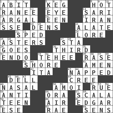 ACROSS 1. "This won't hurt ____!" 5. Cask 8. Being at a high temperature 11. The wife of a rajah (variant) 13. Sight organ 14. Indian skirt 15. Therefore, facetiously 16. Car or cant ending 17. SW Asia republic 18. Compass dir. 19. Lairs 21. Having winglike extensions 22. Moved rapidly 24. Old wives' tales, e.g. 25. Michaelmas daisies 27. R.R. building 29. Leaves 30. One of three equal parts 32. Inside; within (prefix) 33. Giggle 35. To erase 39. Dinah or Pauly 41. So be it 42. Call ___ day 43. Slept 45. Small valley 48. Algonquian 49. Relating to the nose 50. Mine, in Marseilles 52. Regret 55. Opposed to 56. Mouth or opening 57. Any of the three canals of the cochlea 59. Adolescent 60. Atmosphere 61. _ Allan Poe 62. Compass dir. 63. Actress Charlotte 64. Elected reps. DOWN 1. Ancient river in northeast Turkey 2. Taverns 3. Eaten 4. Beverage made from leaves 5. Peachy ____! 6. Snake ____ (dice throw) 7. Commissioned military rank (abbr.) 8. Ethiopian city, capital of Harari 9. Declaim 10. Prong on a fork 12. A person who is older than you are 14. Grain storage tower 20. Begley and Asner 21. Having or resembling wings 23. Mexican monetary units 25. Personal question 26. Manchild 27. A female animal or person 28. Make a knot 30. Definite Article 31. Window treatment 33. Small child 34. Epoch 36. Electrical Measurement 37. Observe 38. Conclude 40. Land elevation 43. Non-commissioned officer (abbr.) 44. Get up 45. Natives or inhabitants of Denmark 46. First name in cosmetics 47. (Had) reclined 49. Nathan's nickname 50. Roberta Peters solo 51. Female horse 53. ____ Bator, Mongolia 54. Hearing organs 56. Rowing implement 58. Music discs