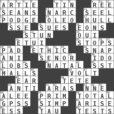 ACROSS 1. Nick name for Arthur 6. Metal container 9. To separate or throw off 12. Actors Connery and Penn 13. Drug cop 14. Sew up the eyelids of hawks and falcons 15. Porridge 16. Margarine 17. Frame or body of a ship 18. Compass dir. 19. Takes to court 20. Immeasurably long periods of time 21. Make senseless or dizzy 23. Fr. "Yes" 24. Needle holder 25. Closes up, plugs up 28. Groovy apt. 30. Principle of right and wrong 34. Fastener 35. Black tropical American cuckoo 36. Sir (Sp.) 38. Wedding promise 39. Tennis shots 41. Relating to or accompanying birth 43. Fast jet (abbr.) 44. Shopping centers 46. Electrical Unit 48. Ewer handle 49. False hair 50. Opposed to 51. Caspian sea tributary 53. Compass dir. 56. Toward shelter 57. Demure 58. Add up to 60. Global Positioning Systems (abbr.) 61. Simple or foolish person 62. Get up 63. Double-curved letter 64. The 19th letter of the Greek alphabet 65. Trials DOWN 1. Cleo's killer 2. Vintage cars 3. Bits 4. Swallow 5. Compass dir. 6. Story 7. Angers 8. Non-commissioned officer (abbr.) 9. One who advocates reunion 10. Snakelike fish 11. Pipe bend 13. Part of speech 14. Yells 19. Sets or collections 20. Greek goddess of the dawn 22. Third day of the wk. 24. The property of being fit to eat 26. Writing tablets 27. Specific locale 28. Inside of hand 29. Small Philippine buffalo 31. Layer 32. _ tizzy (2 wds.) 33. Small bed 37. All-night dance parties 40. Chalkboards 42. Car dealer's back yard 45. _ Lanka 47. Poe poem 49. Pack (down) 50. High mountains 51. Roberta Peters solo 52. Tall New Zealand timber tree 54. Nuclear Threat Initiatives 55. 90 degrees 56. Ripen 57. Pacific Standard Time (abbr.) 58. Make lace 59. French article