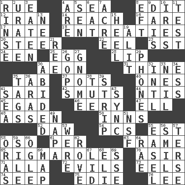 ACROSS 1. Regret 4. Toward the sea 8. Prepare for publication 12. SW Asia republic 14. Arrive at 16. Conductor's collection 17. Nathan's nickname 18. Pleas 20. Bull 22. Snakelike fish 23. Fast jet (abbr.) 24. Car or cant ending 25. Ovum 28. Mouth edge 30. Period of immesurable duration 31. One or ones belonging to thee 35. Keyboard key 37. Plant holders 40. Singles 41. Indian skirt 42. Particles of soot 44. Nuclear Threat Initiatives 45. Mild oath 46. Suggestive of the supernatural 47. Pipe bend 48. NE Netherlands city 50. Restaurants 52. Simpleton 54. Personal Computers (abbr.) 55. Eastern Standard Time (abbr.) 58. Bear (Spanish) 61. For each 63. Movie unit 65. Complicated, petty procedures 70. SW Saudi Arabia district 71. Silent film actress Nazimova 72. Vices 73. Snakelike fish 74. Ooze 75. Singer Brickell 76. Area sheltered from the wind DOWN 1. Remove soap 2. A salt of uric acid 3. Consumed 4. "We ___ not amused" (Victoria) 5. Elected rep. 6. Ingest 7. 43,560 square feet 8. Newt 9. Raised platform 10. Angers 11. Trial 13. Born 15. The bottom of a shoe or boot 19. Set down 21. Portuguese money of account (variant) 26. Republicans 27. Dwarf 29. Gives a jingle 30. Tolerated 32. International (abbr.) 33. Famous astronaut Armstrong 34. Curvy letter 35. Labels 36. Caspian sea tributary 38. Third day of the wk. 39. Remove all contents or possession from 41. Ocean 43. Synchronize (abbr.) 49. California wine valley 51. Science/research agcy. 53. Past tense of be (plural) 55. Artist's stand 56. Grin 57. Laconic 58. Mouths or openings 59. Filth; sediment 60. Stare at amorously 62. Be footloose 64. Actress Charlotte 66. Atlas unit 67. Hat (slang) 68. Connecticut Ivy Leaguer 69. Compass dir.