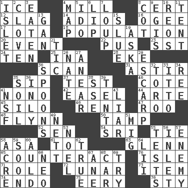ACROSS 1. Frozen water 4. Place where flour is made 8. Sure thing 12. Volcanic refuse 14. Goodbye (Sp.) 16. Double curve, resembling the letter S 17. Globular water bottle used in Asia 18. Census information 20. Incident 22. Purulenc 23. Fast jet (abbr.) 24. "___ Little Indians" 25. _ tizzy (2 wds.) 28. Supplement with great effort 30. Examine minutely or intensely 31. Being in motion 35. Small drink 37. Trial 40. ____ d'Azur (French Riviera) 41. Words to Nanette 42. Artist's stand 44. Johnson of "Laugh-In" 45. Grain storage tower 46. Painter Guido (1575-1642) 47. Friend of Pooh 48. Film actor Errol 50. Pack (down) 52. Elected rep. 54. Indian title of respect (Mr.) 55. Standoff 58. White ___ sheet 61. Small child 63. American astronaut and politician John 65. Frustrate 70. Small island 71. Hero or heavy, e.g. 72. Type of eclipse 73. A whole individual unit 74. Inside; within (prefix) 75. Suggestive of the supernatural 76. Filthy place DOWN 1. Small island 2. Garlic unit 3. Ingested 4. Atlas unit 5. Wedding promise 6. Mouth edge 7. Central Nebraska county 8. Small bed 9. Armor plate that protects the chest 10. Vintage cars 11. Portable shelter 13. Separate the seeds from cotton 15. Turn sharply 19. "____ silly question..." 21. Nervous spasm 26. Nathan's nickname 27. Approach 29. Fortification 30. Soup utensils 32. "Corrida" creature 33. "Tell ____ the Marines!" 34. Portuguese money of account (variant) 35. Land 36. In an inward manner 38. Compass dir. 39. Portable shelters 41. Overdraft (abbr.) 43. One who doesn't tell the truth 49. Remaining after all deductions 51. Russian fighter aircraft 53. Christmas carol 55. Trials 56. An arm off of a larger body of water 57. Foe 58. 1/640 square mile 59. Within a short period 60. Old (Scot.) 62. Loyal 64. Cards in a Roman deck? 66. Modern: prefix 67. A saturated hydrocarbon 68. Automobile 69. Attempt