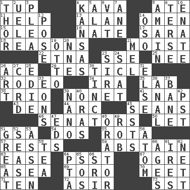 ACROSS 1. Uncastrated adult male sheep 4. Polynesian shrub of the pepper family 8. Had dinner 11. Aid 13. ____ Jay Lerner 14. Presage 15. Butter sub 16. Nathan's nickname 17. "Two Mules for Sister ____" 18. Thinks logically 21. Damp 22. Inactive volcano in Sicily 23. Compass dir. 25. Born 26. Adept person 29. A testis 32. Cowboy competition 34. Lyricist Gershwin 35. Experiment locale 38. Musical group of three 39. Music written for nine 41. Fastener 43. Lair 44. Curve 45. Actors Connery and Penn 46. Elected representatives 50. Allow 51. Girls' org. (abbr.) 54. Two (Sp.) 55. Roll call or roster of names 57. Musical pauses 59. Refrain by choice 63. Relaxation 64. Inconspicuous attention getter 67. Legendary monster 68. Toward the sea 69. "Corrida" creature 70. Confront 71. "___ Little Indians" 72. SW Saudi Arabia district 73. Fast jet (abbr.) DOWN 1. Son of Odin 2. Ubangi River tributary 3. Entreaty 4. Sunflower state 5. Chicken ___ king 6. Large container 7. One (Scot) 8. At full speed 9. Laconic 10. Related on the mother's side 12. Introduce or present, as a question 14. Bear (Spanish) 19. "Beetle Bailey" pooch 20. Compass dir. 21. Cartoonist voice _ Blanc 23. The founder of a family 24. Go away! 26. Nonscientific branch of learning 27. Drawstring 28. Singer Brickell 30. A color or tint 31. Otherwise 33. Immeasurably long periods of time 36. Of or related to the anus 37. Object of repulsion 39. Billionth: prefix 40. Mouths or openings 42. Pacific Standard Time (abbr.) 45. Fast planes 47. Begley and Asner 48. Speaker 49. Director Reiner 51. Relatively large 52. Gospel singer Marvin 53. NE Netherlands city 56. Smallest unit of an element 58. Afternoon social gathering 60. Ripens 61. Angers 62. Remaining after all deductions 64. Parent Teacher Association (abbr.) 65. Distress signal 66. _ Lanka