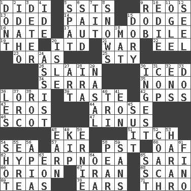 ACROSS 1. "You Light Up My Life" star Conn 5. Fast planes 9. Vintage cars 13. Wrote a lyric poem 14. Ache 15. Evade 16. Nathan's nickname 17. Car 19. Definite Article 20. It would 21. Armed conflict 22. Snakelike fish 23. Mouths or openings 25. Filthy place 26. Killed 30. On the rocks 34. Spanish missionary in California 35. Words to Nanette 36. Australian parrot (variant) 39. Clothes sense 42. Global Positioning Systems (abbr.) 43. Greek god of love 44. Came up 46. Native of Scotland 47. "_ and Lucy" (Charlie Brown theme song) 48. Make supply last 51. Hankering 54. Ocean 57. Wind 58. Pacific Standard Time (abbr.) 60. Clumsy lout 62. Abnormally rapid or deep breathing 65. Indian skirt 66. Greek mythologigal hunter 67. SW Asia republic 68. Examine hastily 69. Afternoon social gatherings 70. Hearing organs 71. Through, poetically DOWN 1. Do not 2. Potato state 3. Prevent from occurring 4. Binary compound 5. Argument over a trivial matter 6. Saudi Arabian king (1953-1964) 7. Teat (slang) 8. Overwhelms 9. Director Reiner 10. Singer Brickell 11. Stare at amorously 12. Stitch closed the eyes of (a falcon) 15. Small, narrow, flatbottom fishing boat 18. Floor protector 20. Capri or Wright 24. Help 27. Tate display 28. Lyricist Gershwin 29. Relating to the nose 30. Eat 31. Police officer (slang) 32. Followers of ems 33. Two (Sp.) 36. French article 37. The grampus (Milton) 38. Friend of Pooh 40. Three (prefix) 41. Period of immesurable duration 45. Costume for a special activity 48. Merit 49. Monetary unit of Laos 50. Bert's buddy 52. Team commander 53. Ethiopian city, capital of Harari 54. Opportunity 55. Jane of fiction 56. Capital of Western Samoa 58. Lightbulb-shaped fruit 59. Without 61. Fine (Spanish) 63. Greek goddess of the dawn 64. Mouth or opening 65. Fast jet (abbr.)