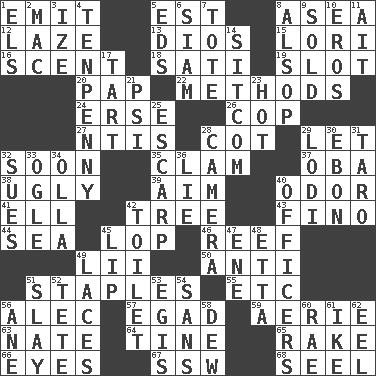 ACROSS 1. Send forth 5. Eastern Standard Time (abbr.) 8. Toward the sea 12. Goldbrick 13. "Vaya con ____" 15. Australian parrot (variant) 16. Aroma 18. Suttee (variant) 19. Slit 20. Infant food 22. Modes 24. Celtic language 26. Police officer (slang) 27. Nuclear Threat Initiatives 28. Small bed 29. Allow 32. Within a short period 35. Dollar (slang) 37. Chief or king in Benin or Nigeria 38. Unsightly 39. Direct toward a target or goal 40. Scent 41. Pipe bend 42. Family _ (genealogy) 43. A pale, very dry sherry 44. Ocean 45. Trim (branches) 46. Coral ridge 49. Cards in a Roman deck? 50. Against 51. Paper fasteners 55. And so on (abbr.) 56. Actor Baldwin 57. Mild oath 59. Nest on high 63. Nathan's nickname 64. Prong on a fork 65. Immoral or dissolute person 66. Sight organs 67. Compass dir. 68. Sew up the eyelids of hawks and falcons DOWN 1. Raised railways 2. Big _ 3. Ending with capital 4. 3-inch nail 5. Begley and Asner 6. Thailand, formerly 7. Carryall 8. Columnist Joseph or Stewart 9. Exchanged or delivered for money 10. Greek god of love 11. Small island 14. "Cheers" or "Ellen" 17. Small pie 21. 23rd letter of the Greek alphabet 23. Being at a high temperature 25. Fortification 28. Device for capturing images 29. Farming town in central California 30. Inky black, to poets 31. Pacific island yam 32. Institutes legal proceedings 33. Stare 34. Rounded earthenware pot or jar 36. Whopper 40. Persons of authority 42. Bathroom plumbing fixture 45. Mouth edge 47. Compass dir. 48. Singer James 49. Shoestrings 51. Kill 52. False hair 53. The front part of a cuirass 54. Without 56. A saturated hydrocarbon 58. Morning condensation 60. Actress Charlotte 61. D.D.E's nickname 62. Snakelike fish