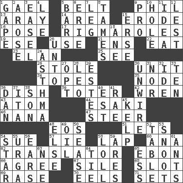 ACROSS 1. Highlander 5. Waist strap 9. Silvers or Donahue 13. Like ___ of sunshine 14. Type of rug 15. Wear away 16. Airs 17. Complicated, petty procedures 19. Compass dir. 20. Purpose 21. Followers of ems 22. Ingest 23. Liveliness 25. Observe 26. Fur scarf 30. A single undivided whole 34. Drinks excessively 35. Thickened enlargement 36. Food container 39. Carrier 42. Songbird 43. Smallest unit of an element 44. 1973 Nobel Price Winner (Physics) Leo 46. Grandmother 47. Navigate 48. Greek goddess of the dawn 51. Allows 54. Institute legal proceedings 57. Untruth 58. Infant locale 60. Santa ___, CA 62. Interpreter 65. Inky black, to poets 66. Match 67. Filth; sediment 68. Narrow opening 69. To erase 70. Snakelike fish 71. Puts into a specified state DOWN 1. Yawn 2. Came up 3. Artist's stand 4. Potassium hydroxide 5. Taverns 6. 4th largest of the Great Lakes 7. Part of a journey 8. Softens 9. Adept person 10. Hollow 11. The main thing one is thinking about 12. For fear that 15. Celtic language 18. One (Scot) 20. To (old English) 24. Respiratory problem 27. Elect 28. Lion 29. _____ Park, CO 30. Undo the wiring of 31. Not either 32. Binary compound 33. Nine, plus one 36. One of the 12 tribes of Israel 37. Call ___ day 38. Manchild 40. Eastern Standard Time (abbr.) 41. Actress Charlotte 45. Seaweed 48. Otherwise 49. Lubricate 50. Gospel singer Marvin 52. Eating place 53. Snout, nose 54. Play the lead 55. Capital and largest city of Mongolia 56. Hearing organs 58. Hang loosely or laxly 59. Ancient Greek god of war 61. Pismires 63. Born 64. Standoff 65. Double-curved letter