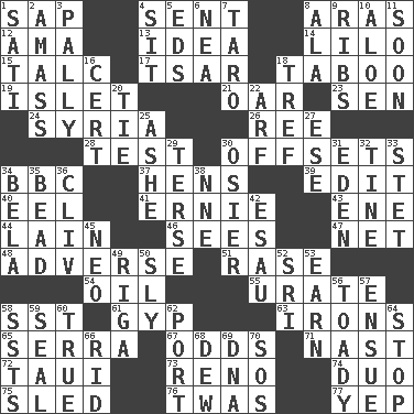 ACROSS 1. Plant excrement 4. Posted 8. Caspian sea tributary 12. Nanny (var.) 13. The content of cognition 14. _ and Stitch 15. Baby powder 17. Russian ruler of old 18. Off limits 19. Small island 21. Boat paddle 23. Elected rep. 24. Damascus' land 26. To sift 28. Trial 30. Counterbalances 34. English channel? 37. Coop moms 39. Prepare for publication 40. Snakelike fish 41. Bert's buddy 43. Compass dir. 44. (Had) reclined 46. Observes 47. Fish or hair follower 48. Contrary to your interests or welfare 51. To erase 54. Petroleum 55. A salt of uric acid 58. Fast jet (abbr.) 61. Con 63. Removes the wrinkles 65. Spanish missionary in California 67. Likelihood 71. Political cartoonist Thomas 72. "Change" in Tahitian 73. Western Nevada city 74. Superhero pair 75. Downhill vehicle 76. It was, poetically 77. Slangy assent DOWN 1. Suttee (variant) 2. Collect or gather 3. Chummy 4. Be seated 5. Begley and Asner 6. Teachers' org. 7. Pacific island yam 8. In the manner of 9. Chest bones 10. _ vera 11. Within a short period 16. An absolute certainty 18. Not kosher 20. Neckwear 22. Sandy's bark 25. American tennis player Robert 27. Compass dir. 29. Laconic 30. Flexible twig of a willow tree 31. Locale of original sin 32. Prong on a fork 33. Proofreading order 34. Actor Lugosi 35. Necklace unit 36. 154 in Roman numerals 38. Compass dir. 42. Son of Isaac 45. Modern: prefix 49. Capital of Latvia 50. Roguish 52. _ Lanka 53. Merit 56. Sycophant 57. Follow as a consequence or result 58. Fast planes 59. Lick closed 60. Loyal 62. Sweet dark-red dessert wine 64. Obstruct or block passage 66. To free from 68. Morning condensation 69. Heredity factor (abbr.) 70. Mayday