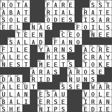 ACROSS 1. Round or rotation of duties 5. Conductor's collection 9. Fast jet (abbr.) 12. Blind as ____ 13. Monetary unit of Yemen 14. Pace 15. Flatfish 16. Lyric poems 17. Austrian river, tributary to the Danube 18. Snakelike fish 19. Tired old horse 21. Fencing necessities 22. Adolescent 24. Corporate head (abbr.) 26. Born 27. First course 28. Papal veil 29. Do some clerical work 30. Entertaining tales 32. Measure of real estate 36. Actor Baldwin 37. Part of HMS, perhaps 38. Supercomputer manufacturer 39. Egg locale 40. Confronts 42. Puff or smoke 43. Caspian sea tributary 44. Came up 46. Small moist lump or mass 49. To free from 50. Religious women 51. Native American of Southwest Alaska 53. Compass dir. 54. Armed conflict 57. ____ Bator, Mongolia 58. Son of Isaac 61. Short-tailed, large-bodied rat 62. Indonesian resort city 63. Celtic language 64. SW Asia republic 65. A female animal or person 66. Cuts off 67. Singer Brickell DOWN 1. To erase 2. Mitch Miller's instrument 3. Baron Munchausen's specialties 4. Had dinner 5. Tree-dwelling hopper 6. Help 7. Actress Charlotte 8. Raised railways 9. Indian antelope 10. Lacking originality or spontaneity 11. Laconic 14. River (Sp.) 19. Teachers' org. 20. Actor Griffith 21. Egg _ yung 23. Voters do this 24. 2nd pers. sing. pres. of can (arch.) 25. Followers of ems 27. Filth; sediment 28. Strips of potato fried in deep fat 29. Air blower 31. Forward in time 32. NE Massachussets city 33. What you're doing now 34. Immoral or dissolute person 35. Sight organ 40. Medical imaging device (abbr.) 41. Without 43. Tate display 45. Regret 46. Applies to a surface 47. Assad's deity 48. Memphis, Tenn. Street 52. Single; one (prefix) 53. Institutes legal proceedings 55. Mountain range southwest of Kyrgyzstan 56. French philosopher Descartes 58. Car or cant ending 59. _ Lanka 60. Cleo's killer 61. Compete