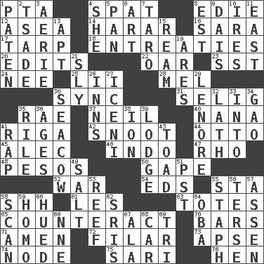 ACROSS 1. Parent Teacher Assoc. 4. Petty quarrel 8. Singer Brickell 12. At sea 14. Ethiopian city, capital of Harari 16. "Two Mules for Sister ____" 17. Canvas cover 18. Pleas 20. Proofreads 22. Boat paddle 23. Fast jet (abbr.) 24. Born 25. Cards in a Roman deck? 28. Cartoonist voice _ Blanc 30. Synchronize (abbr.) 31. Former Milwaukee Brewers owner Bud 35. Actress Charlotte 37. Famous astronaut Armstrong 40. Grandmother 41. Capital of Latvia 42. Snob 44. "Beetle Bailey" pooch 45. Actor Baldwin 46. _ china 47. 17th letter of the Greek alphabet 48. Mexican monetary units 50. Open wide 52. Armed conflict 54. Begley and Asner 55. R.R. building 58. Quiet! 61. French article 63. Hauls 65. Frustrate 70. Soap units 71. So be it 72. Of or pertaining to a thread or threads 73. Domed church section 74. Thickened enlargement 75. Indian skirt 76. Layer DOWN 1. Eucharist need 2. Sadhe (variant) 3. Nest on high 4. A female animal or person 5. Baking dish 6. Nonscientific branch of learning 7. Edible starchy tuberous root 8. Eastern Standard Time (abbr.) 9. Raised platform 10. Angers 11. 90 degrees 13. Fitting 15. 480, 500 or 516 sheets of paper 19. Ancient Greek god of war 21. Roguish 26. Restaurants 27. Ancient Celtic tribe of eastern Britain 29. Poe poem 30. Manatee 32. Thin strip of wood or metal 33. To the inside or interior of 34. E Mali city 35. Cause heat under the collar 36. Grows older 38. Electrically charged atom 39. Inn 41. Hit sharply and swiftly 43. Frog relative 49. Table seasoning 51. Pacific Standard Time (abbr.) 53. Coral collection 55. Staphylococcus 56. Laconic 57. NE Netherlands city 58. Examine hastily 59. Same (prefix) 60. Became colored 62. Indian titles of respect 64. Chief or king in Benin or Nigeria 66. Compass dir. 67. Wing 68. Automobile 69. Three (prefix)