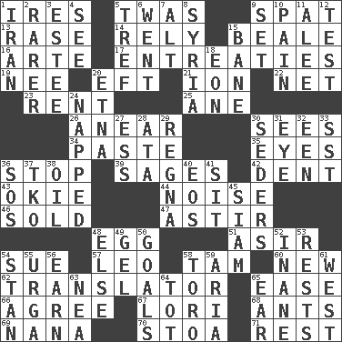 ACROSS 1. Angers 5. It was, poetically 9. Argument over a trivial matter 13. To erase 14. Have confidence or faith in 15. Calif. Air Force Base 16. Johnson of "Laugh-In" 17. Pleas 19. Born 20. Newt 21. Electrically charged atom 22. Fish or hair follower 23. Monthly bill 25. A saturated hydrocarbon 26. Approach 30. Observes 34. Thick mixture 35. Snake ____ (dice throw) 36. Obstruct or block passage 39. Gurus 42. Scratch 43. Migrant worker of the '30s 44. Annoying sound 46. Exchanged or delivered for money 47. Moving about 48. Ovum 51. SW Saudi Arabia district 54. Institute legal proceedings 57. Lion 58. Scottish cap 60. ___ Haven, CT 62. Interpreter 65. Relaxation 66. Match 67. Australian parrot (variant) 68. Pismires 69. Grandmother 70. Portico 71. State of inaction DOWN 1. SW Asia republic 2. Less widely known 3. First name in cosmetics 4. Perceive with the eye 5. Not kosher 6. Gone 7. The first octave above the treble staff 8. Damascus' land 9. Put into a specified state 10. Ache 11. Toward shelter 12. Trial 15. Object of repulsion 18. A really long time 20. Inactive volcano in Sicily 24. Slept 27. Double-curved letter 28. "One Day ___ Time" 29. Rain (Swedish) 30. Spring feasts 31. Sight organ 32. Car or cant ending 33. Fast jet (abbr.) 36. Mayday 37. Ring climax 38. Petroleum 40. Greek goddess of the dawn 41. Be seated 45. Thailand, formerly 48. Otherwise 49. Set 50. Purposes of endeavors 52. Lacking in sense or substance 53. Musical pauses 54. Comedian Laurel of Laurel & Hardy 55. Capital and largest city of Mongolia 56. Merit 58. "Corrida" creature 59. Roberta Peters solo 61. Compass direction 63. Teachers' org. 64. Small child 65. Ewer handle
