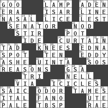 ACROSS 1. Thick or sticky substance 4. Desk light 8. An important port of Yemen 12. Epoch 13. Austrian river, tributary to the Danube 14. Actor's bit 15. Rhinal 18. Louse (plural) 19. For fear that 20. Elected representative 22. Allow head to fall sleepily 23. Use a spoon 24. Plant holder 25. Binary compound 26. Window treatment 30. Bit 33. Leg joints 36. Pulitzer Prize-winning author Ferber 37. Specific locale 39. "___ Little Indians" 40. Whirlpool 41. American tennis player Robert 42. National forest in Provo, Utah 44. Distress signal 45. Thinks logically 47. Girls' org. (abbr.) 50. Three (prefix) 51. 1994 drama film starring Jodie Foster 53. By way of 54. Winter's stalactites 57. Ketch in the Levant 59. Scent 61. Softens 63. Slanted text style (abbr.) 64. Papal veil 65. Shoshoni 66. Light colored 67. Cook's measure (abbr.) 68. Actress Charlotte DOWN 1. Commissioned mil. rank 2. Mouths or openings 3. Fertile tracts in a desert 4. _ and Stitch 5. SW Saudi Arabia district 6. Big _ 7. Before (prefix) 8. One to whom something is allotted 9. Passed on 10. Followers of ems 11. Fish or hair follower 16. Against 17. Put down 21. Long journey 22. Not either 24. Purulenc 26. Penny 27. Sums up 28. _ china 29. Negative votes 30. Russian ruler of old 31. Domed church section 32. Capital of the state of Qatar 34. Nuclear Threat Initiatives 35. Car or cant ending 38. One of the two male reproductive glands 42. Corn or form start 43. Hindu god of fire 46. Mouth or opening 48. Religious group 49. Silent film actress Nazimova 52. Arboreal primate 53. Small bottle 54. Charged particles 55. Riding implement 56. Bristle 57. Small drink 58. "One Day ___ Time" 59. Often (poetically) 60. Pat or tap gently 62. Observe