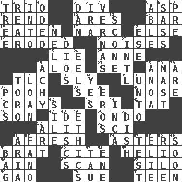 ACROSS 1. Musical group of three 5. HTML Container Element 8. Cleo's killer 11. Tear apart 12. Ancient Greek god of war 14. Soap unit 15. Eroded 17. Drug cop 18. Otherwise 19. Worn away 21. Annoying sounds 23. Whopper 25. Queen of England 1702-14 26. _ vera 27. Arrange properly for use 28. Housemaid (var.) 31. Affectionate concern, for short 33. Playfully artful 35. Type of eclipse 37. "Silly old bear" 38. Perceive with the eye 40. Olfactory organ 41. Trading vessels 43. _ Lanka 45. Make lace 46. Boy, to dad 47. Binary compound 50. Southwest Nigerian state 52. Came down and settled, as after flight 53. _-fi 54. Anew 56. Michaelmas daisies 61. Naughty child 62. Quote 65. Sun: prefix 66. The 18th letter of the Arabic alphabet 67. Examine minutely or intensely 68. Grain storage tower 69. E Mali city 70. Take to court 71. Adolescent DOWN 1. Relationship diagram 2. Posterior 3. To the inside or interior of 4. Wrote a lyric poem 5. One of the 12 tribes of Israel 6. Retirement account (abbr.) 7. Actresses Bloom and Felton 8. Competent 9. Backtalk 10. Before (prefix) 13. Biscuitlike quick bread 16. 1994 drama film starring Jodie Foster 18. Compass dir. 20. "Vaya con ____" 22. International (abbr.) 24. Snakelike fish 26. Painful 28. Small Philippine buffalo 29. Vertical spar for supporting sails 30. "We ___ not amused" (Victoria) 31. "Corrida" creature 32. Grant temporary use of 34. Consenting reply 36. To (old English) 37. Personal Computers (abbr.) 39. Greek god of love 42. Filth; sediment 44. South American Indian 48. Plates 49. Value system 51. Food container 52. Tate display 54. Roberta Peters solo 55. Papal veil 57. Trial 58. Writer Wiesel 59. Cause heat under the collar 60. Within a short period 61. Paper or plastic container 63. The 19th letter of the Greek alphabet 64. Compass dir.