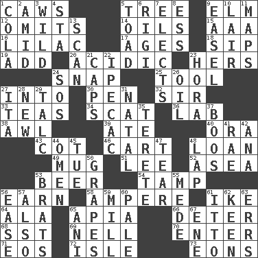 ACROSS 1. Crow sounds 5. Woody plant 9. Shade tree 12. Leaves out 14. Lubricates 15. Auto club (abbr.) 16. Pale purple color 17. Grows older 18. Small drink 19. Find the sum of 20. Being or containing an acid 23. Possessive pronoun 24. Fastener 25. Implement 27. To the inside or interior of 30. Animal enclosure 32. Title for a knight 33. Beverages made from leaves 34. Scram! 36. Experiment locale 38. Leather borer 39. Had dinner 40. Mouth or opening 43. Small bed 46. Heavy open wagon 48. Grant temporary use of 49. Large cup 51. Area sheltered from the wind 52. Toward the sea 53. Fermented drink made from hops 54. Pack (down) 56. Merit 58. Electrical Unit 61. D.D.E's nickname 64. Chicken ___ king 65. Capital of Western Samoa 66. Prevent from occurring 68. Fast jet (abbr.) 69. 1994 drama film starring Jodie Foster 70. Keyboard key 71. Greek goddess of the dawn 72. Capri or Wright 73. Immeasurably long periods of time DOWN 1. Root beer relative 2. Among 3. Rampant 4. R.R. building 5. Frog relative 6. Swiss mountan, "Queen of the Mountains" 7. Opts 8. Double-curved letter 9. Artist's stand 10. Den 11. Atlas contents 13. Examine hastily 21. Balmoral and tarboosh 22. Medicinal drug used to evoke vomiting 23. Israeli folk dance 24. Distress signal 26. Petroleum 27. Call ___ day 28. ___ Haven, CT 29. Baby powder 31. Brizilian seaport 35. Cigar-shaped 37. Scornful sounds 41. Actress Charlotte 42. Santa ___, CA 44. Sign of something about to happen 45. Third day of the wk. 47. Rend 48. Pet locale 50. Wine fruits 53. Naughty children 55. Ancient Persian 56. Relaxation 57. In addition 59. Place where flour is made 60. Diluted with white 61. "Tell ____ the Marines!" 62. Peachy ____! 63. Blunders 65. Cuckoo 67. Compass dir.
