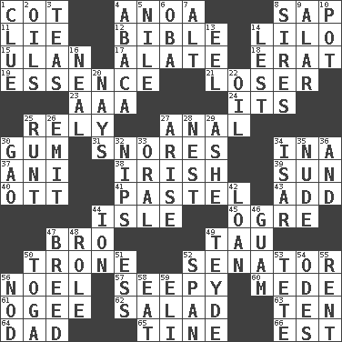 ACROSS 1. Small bed 4. Small Philippine buffalo 8. Plant excrement 11. Whopper 12. The Good Book 14. _ and Stitch 15. ____ Bator, Mongolia 17. Having winglike extensions 18. Part of Q.E.F. 19. Core 21. Failure 23. American Automobile Association (abbr.) 24. ___ a Wonderful Life 25. Have trust in 27. Of or related to the anus 30. Chewing product 31. Sounds asleep 34. _ tizzy (2 wds.) 37. Black tropical American cuckoo 38. From or relating to Ireland 39. Player for Phoenix 40. Baseball player Mel 41. Soft color 43. Increase 44. Capri or Wright 45. Legendary monster 47. Sis' sibling 49. The 19th letter of the Greek alphabet 50. Heavy duty weighing machine 52. Legislator 56. Christmas carol 57. Oozy 60. Ancient Persian 61. Double curve, resembling the letter S 62. First course 63. Nine, plus one 64. June honoree 65. Prong on a fork 66. Eastern Standard Time (abbr.) DOWN 1. A slight indication 2. Lubricates 3. Afternoon social gatherings 4. Phillipine bananalike plant 5. The longest river in the world 6. Chief or king in Benin or Nigeria 7. The first octave above the treble staff 8. Fathers 9. Having or resembling wings 10. Plant holder 13. Snakelike fish 14. For fear that 16. Anneal 20. Negative votes 22. Petroleum 25. Undersized animal 26. Give off 27. Ascend 28. Egg locale 29. American tennis player Robert 30. E Mali city 32. Cuts off 33. Taken by mouth 34. Austrian river, tributary to the Danube 35. Unadorned 36. Also 42. Grant temporary use of 44. Electrically charged atom 46. Island territory of the United States 47. A special lineage 48. Hero or heavy, e.g. 49. Miss Universe 1986, Barbara Palacios _ 50. Ancient Roman robe 51. Double-curved letter 52. Connect, as a bridge 53. False hair 54. Lyric poems 55. Monthly bill 56. Allow head to fall sleepily 58. Consume 59. Connecticut Ivy Leaguer